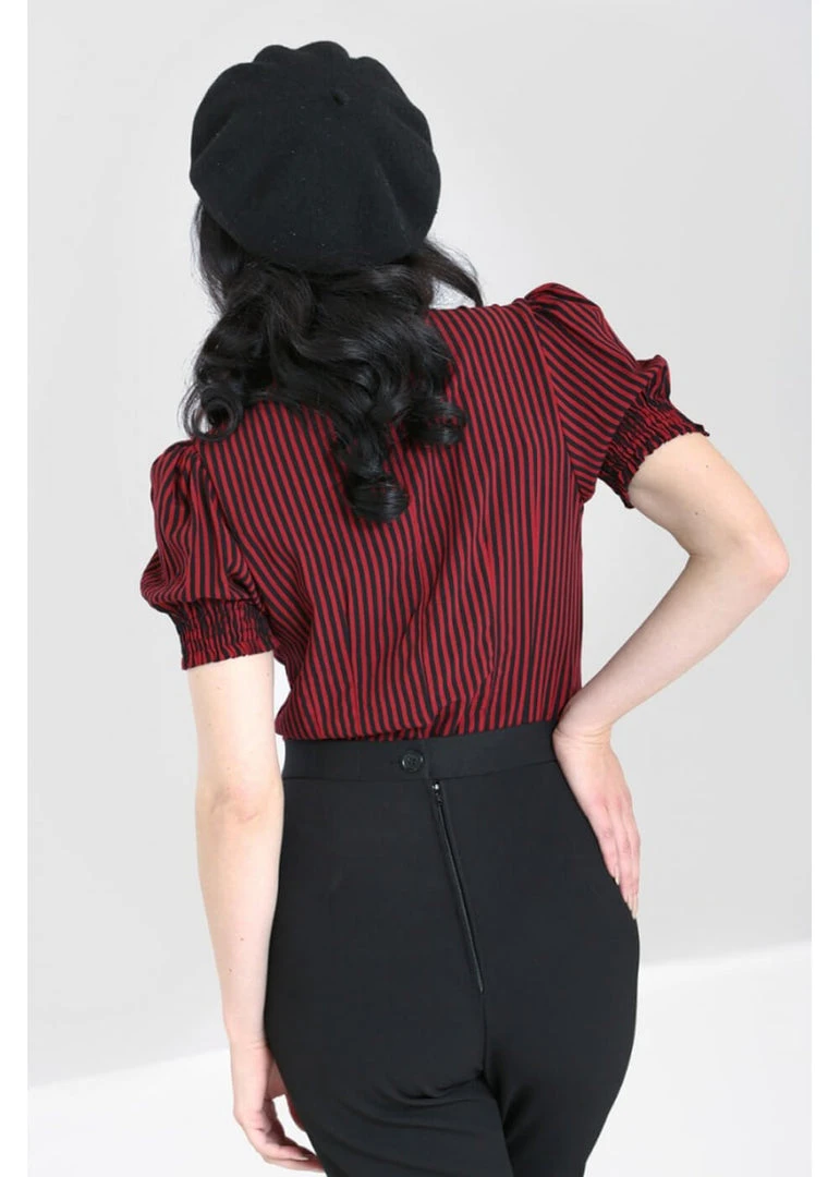 The collar continues into an elegant pussy-bow, which for a change has a black back. How cute does that look when you tie her! This beauty is a loose fit model which shapes gorgeously thanks to her seams and closes with smooth buttons. Her short sleeves puff up playfully because of the elastic. She is made of an airy viscose and is more than perfect for wearing with your perfect skirt, but is just as cute with a pair of cool jeans.