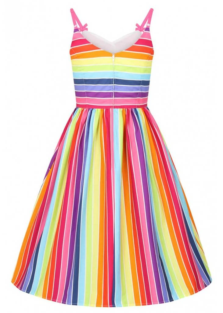 This paragon of cheerfulness has adjustable shoulderstraps and a gorgeously formfitting bodice with princess seams. From just above the waist she flares out into a full skirt with pockets, which you can stunningly combine with one of our petticoats to really make that rainbow shine.