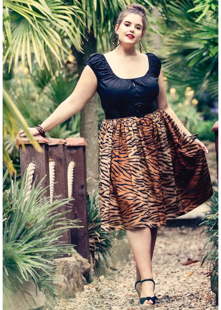 Rockabilly, tiki or a little tacky, a good tiger print is always welcome! From the waistband down she flares out through pleats into a full skirt with pockets, and is perfect for wearing with one of our petticoats to make those stripes roar. With a height of 1,70 she reaches down over the knee and closes with a zipper and button on the back.