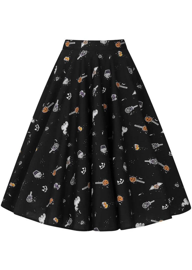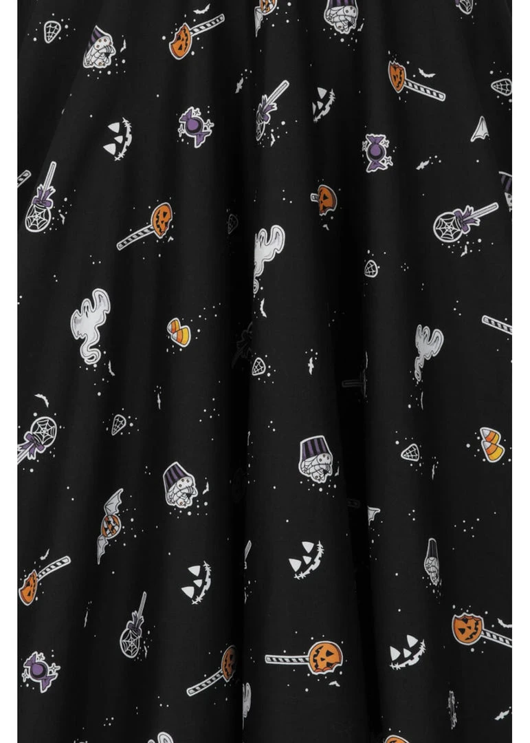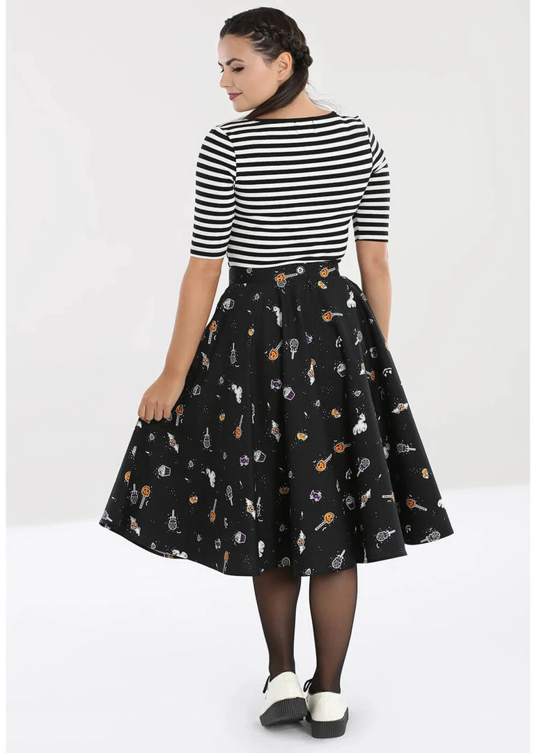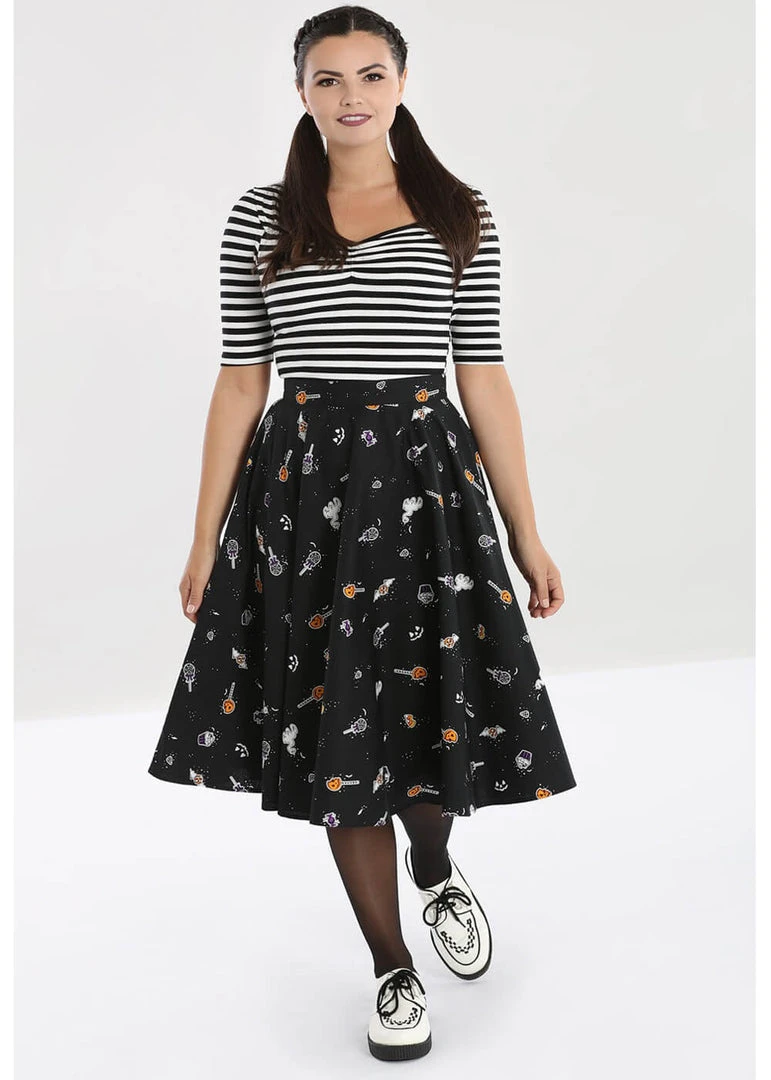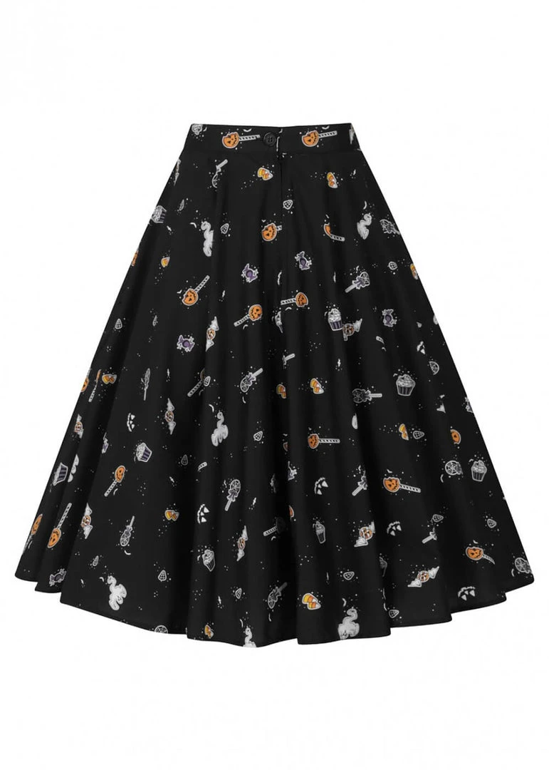 Half eaten lollipops, cupcakes and pumpkins, it’s easy to see where the inspiration came from! This beauty is made of lightweight cotton in a full-circle skirt with pockets, and the candy seems to fly off of it once you start swinging! The waist has no stretch. Of course, this beauty can be worn with one of our petticoats to make all those treats come to life. For a body length of 1.70 m, the skirt ends below the knees, it closes with a button and a zipper in the back.