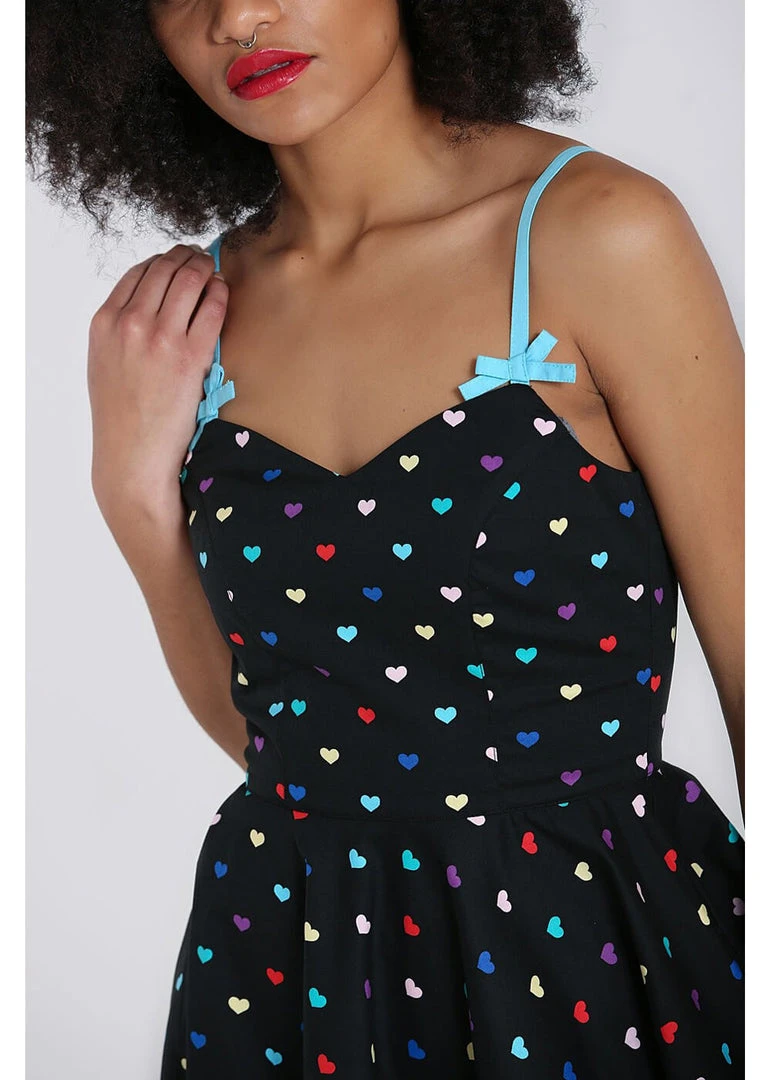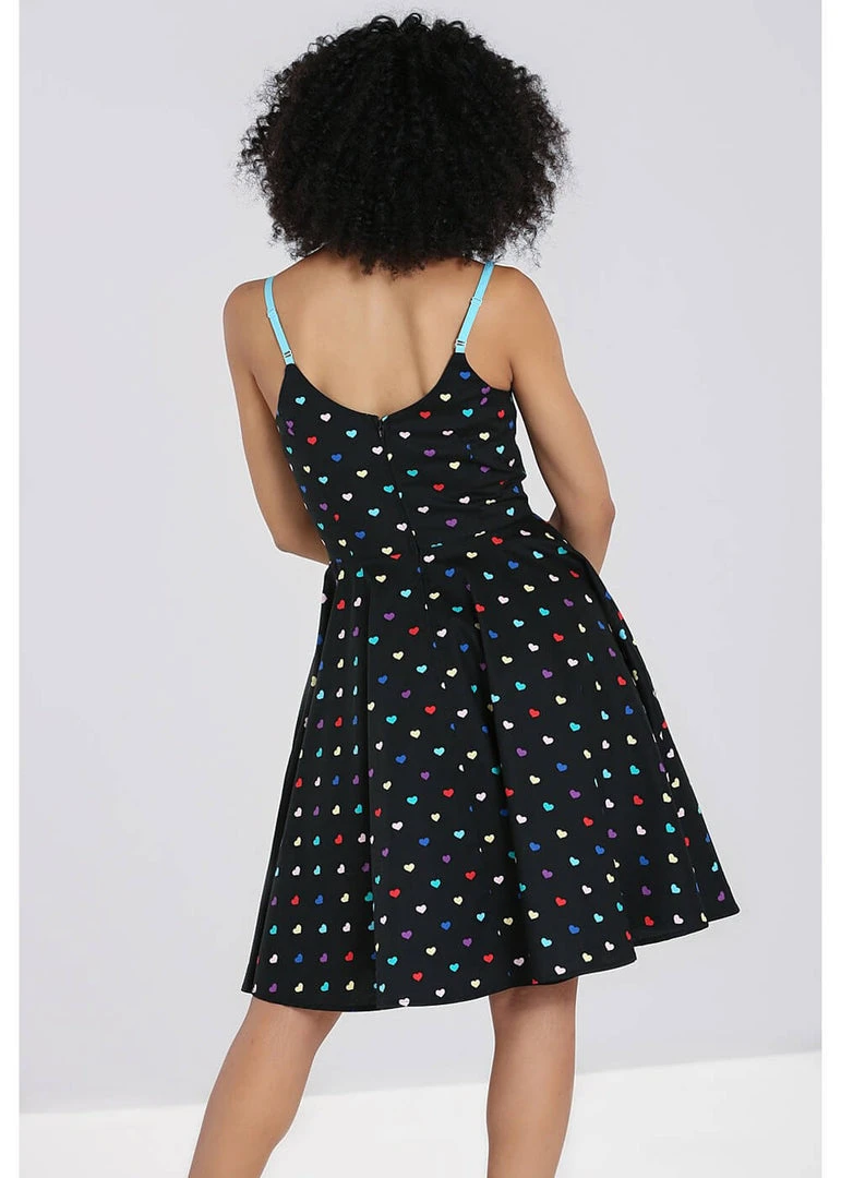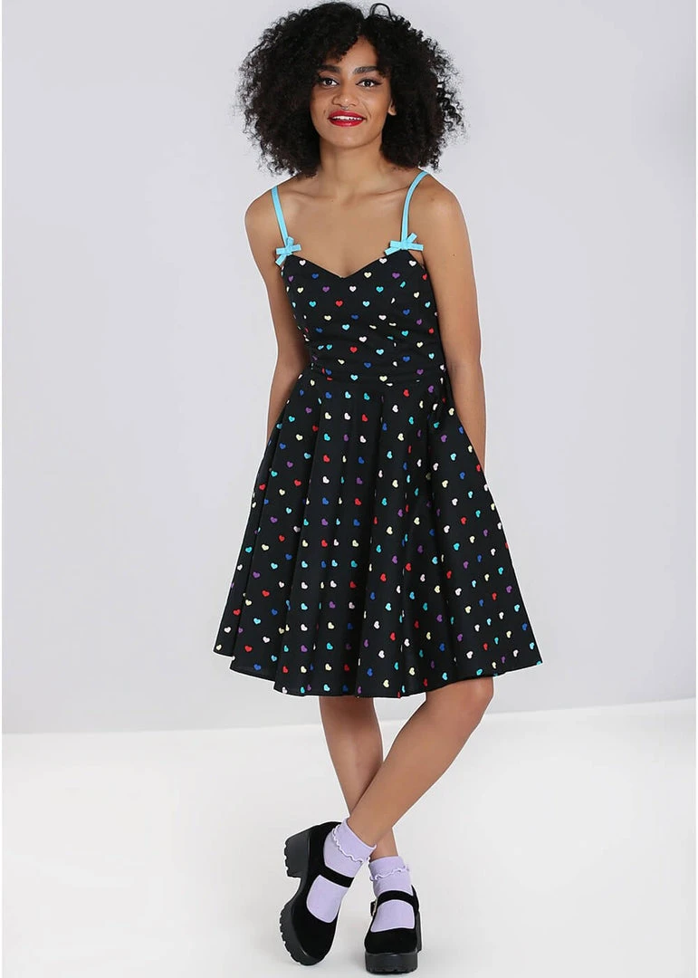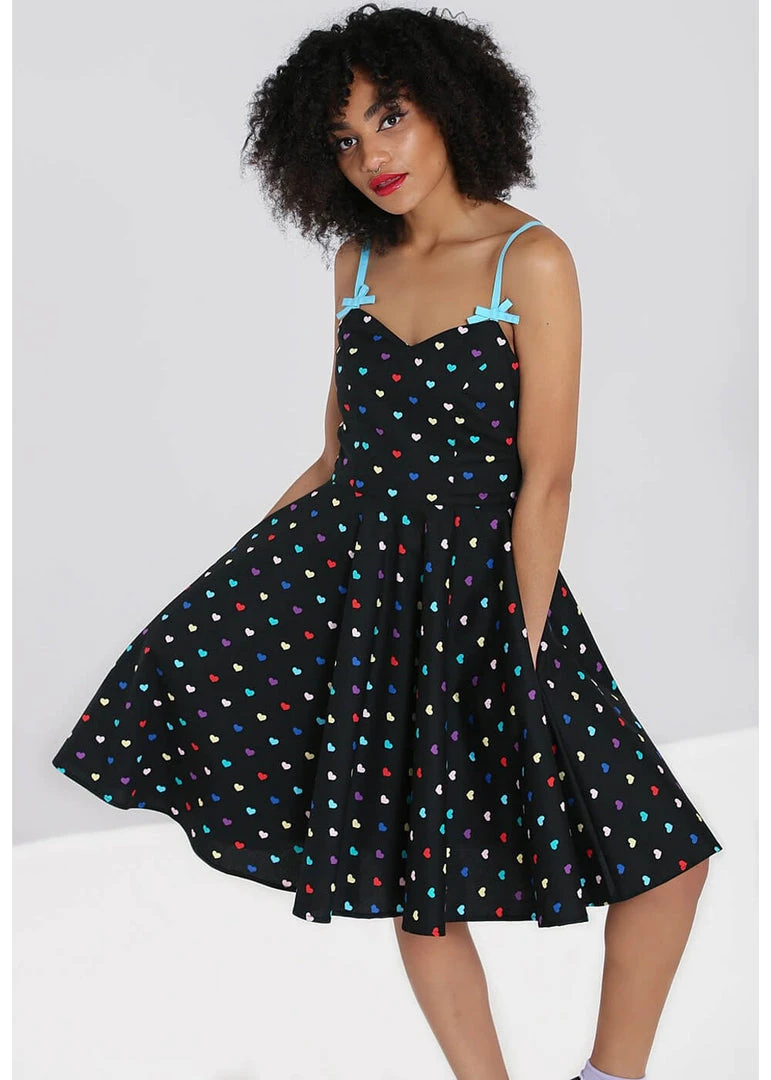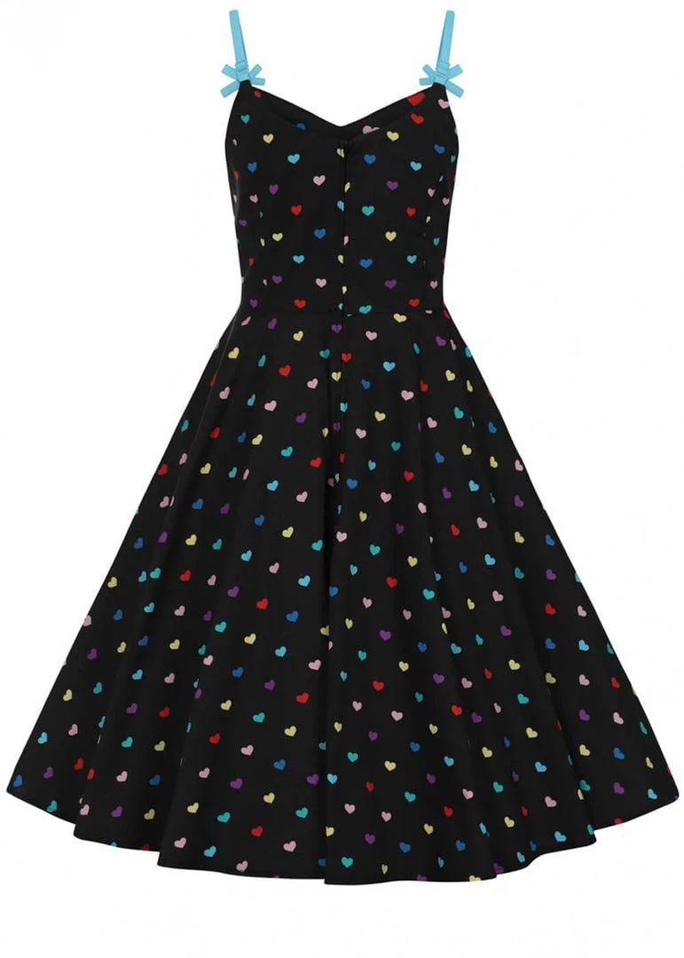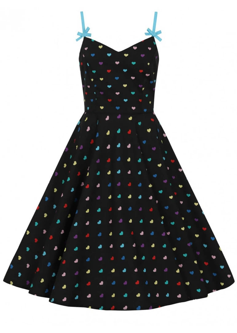 This ode to the love has adjustable shoulder straps and a bodice which is gorgeously formfitting thanks to the princess seams. From the waist seam she flares into a full skirt with pockets, that you can gorgeously combine with one of our petticoats to spread the love even better.