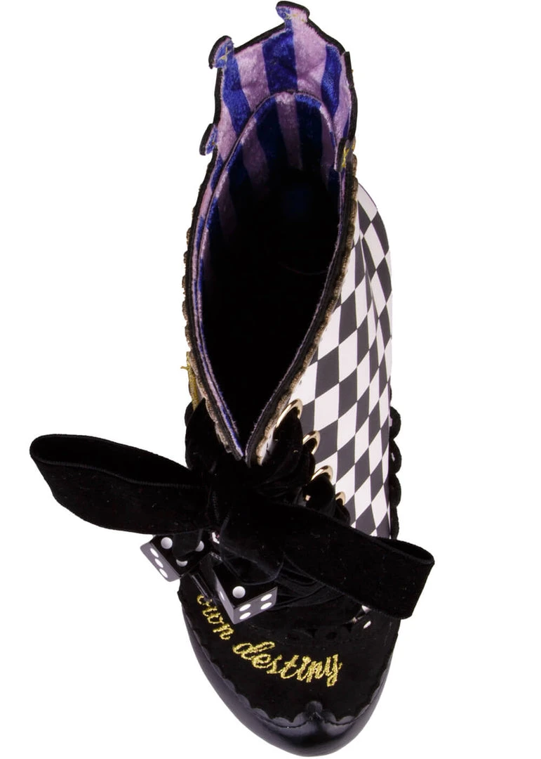 ‘Queen of my own destiny’: our motto not only in games, but also in life! That’s why we wear these words with pride, embroidered on the faux-suede tip of these gems, just like the countless details on the diamond checkered background and the crown on top of the backside. They close with velvet laces in the front, with little dices for even more luck 😉