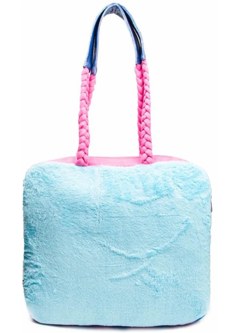This ENORMOUS bag is richly decorated with glitters, metallics, pastel colours and embroidered hearts. And of course the cute 3-D teddybears whose legs are dangling from the bag! The soft handles are big enough for you to wear them on your shoulder, but there also is a detachable shoulder strap. It closes with a zipper and the back is decorated with soft faux-fur.