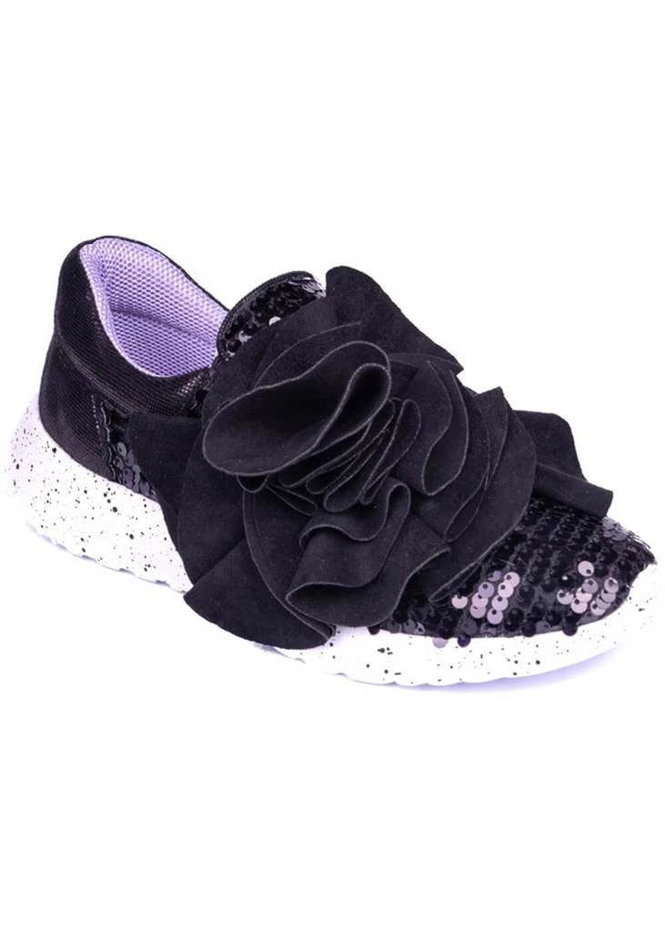 Of course in a totally Irregular Choice way 😉 Not only do they have black sequins and black shiny metallic, but ofcourse she also has an enormous faux-suede flower on top! Because of the soft footbed, elastic pieces and thick ascending sole these cuties feel like a dream to wear, A sporty look with an extraordinary twist! Do note, look sporty but don’t act sporty, these are not sports shoes 😉
