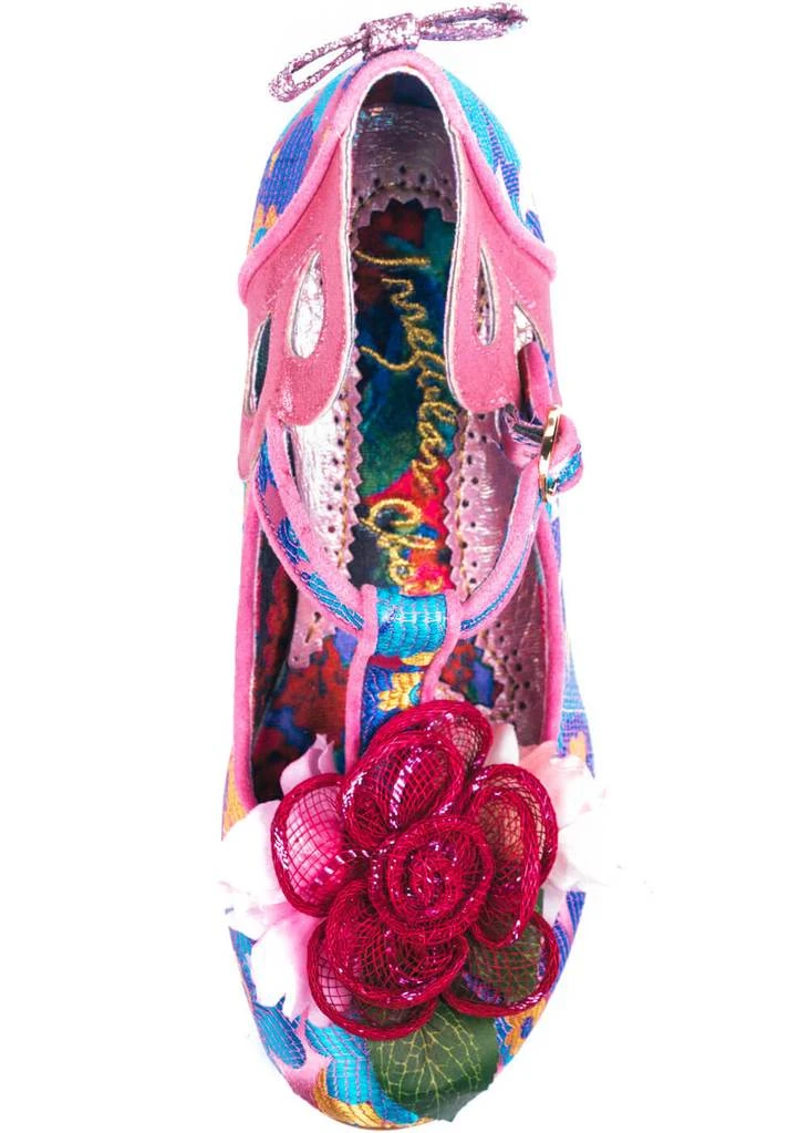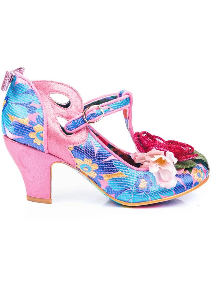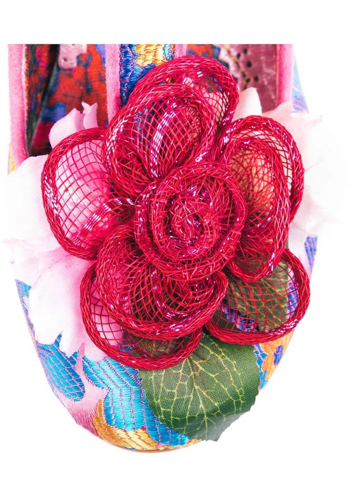 Your botanic wonderland is always close at hand with her breathtaking flower brocade, which even continues across the t-strap and adjustable ankle strap. The graceful curls by the ankle and that low 6,5 cm heel are cheerfully shimmering together with the soft metallic. And did you notice that small bow on the heel yet? So sweet! The nose is decorated with a large flower, finished with flower petals and leaves.