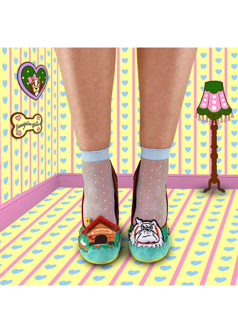 The shoe itself is a spectacle, too, it’s like a garden! The fence on the side keeps the dog hut and the tough bulldog where they belong.