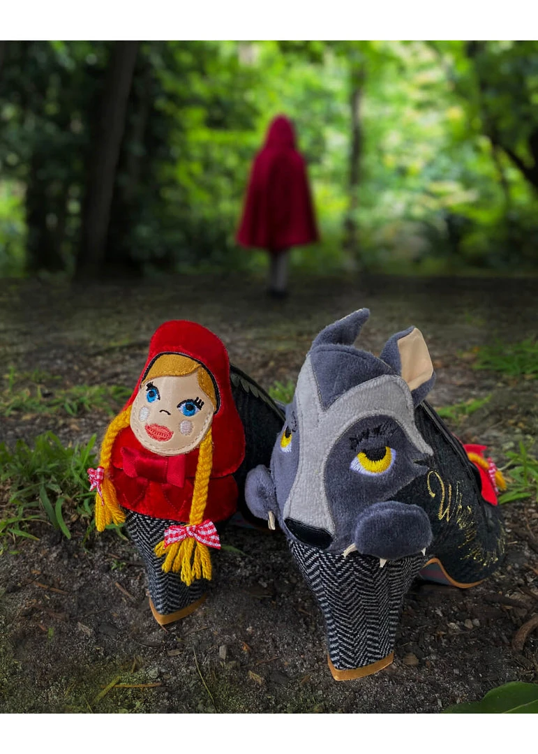 Wherever she is, he’s not far away! Threateningly, he’s waiting on the tip of one and at the heel of the other shoe, while Little Red Riding Hood is just on the other side… The shoe itself is covered in tartan and has a fine heel, that is also nicely wide. Charming, yet super comfortable! The big embroidered questions on the sides complete the story. The shoes are narrowing towards the heel, so you don’t slip out as easily.