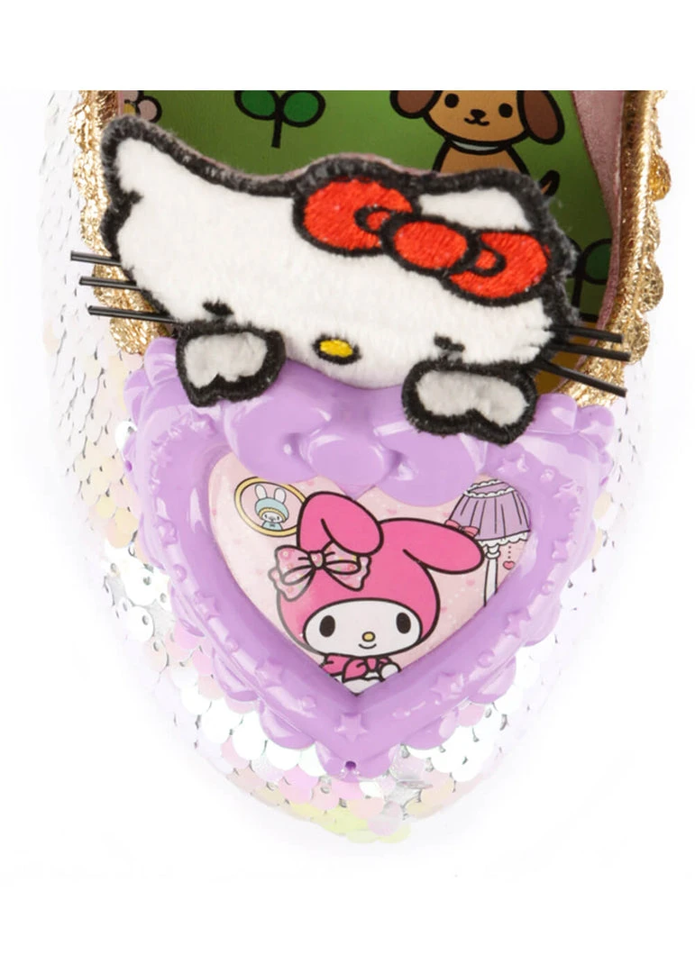 Hello Kitty is the ‘Star of the Show’: she even is the heel! Her iconic bow is ruling the back of the shoe, and from the tip, she’s looking at you together with My Melody.