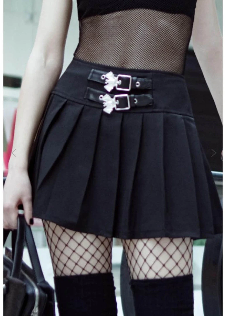 Conquer the world one stare at a time, with the happy bats adorning the buckles of this school-uniform-y mini skirt… You wear this beauty in the waist, from where flat pleats are flaring until far above the knees for a height of 1,70 m.
