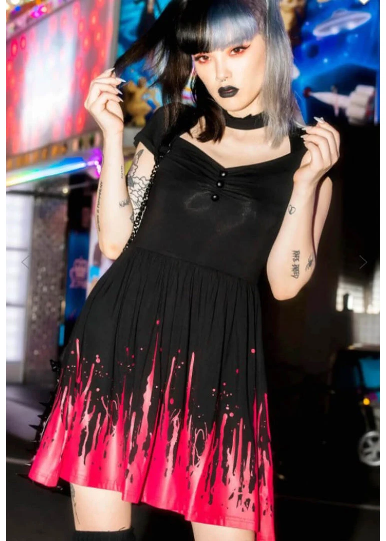 With her smooth and stretchy jersey-rayon-mix she’s dreamy to wear, while her bloodthirsty print looks like you just escaped an 80’s slasher movie. From the waist, small drapes flare into a playful skirt, that ends above the knees for a height of 1.70m. No zipper needed: You can just slip in, she only has decorative buttons on the chest and a small button in the neck to close the peekaboo.
