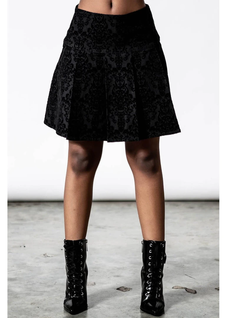 How cute she is, with her school-uniform flat pleats from halfway down and her length until far above the knees for a height of 1.70m… Or isn’t she, with the occult pattern in velvet?