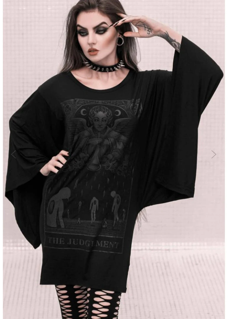 The oh so wide kimono-sleeves almost have you flapping away, this is a dramatic look without effort! The neckline and the bodice are nicely relaxed, while the fit narrows a little around the thighs. She is made of a soft jersey of a rayon-mix with fine stretch. For a height of 1.70m, she reaches way above the knees. Good panty, cool boots and you’re ready to go!