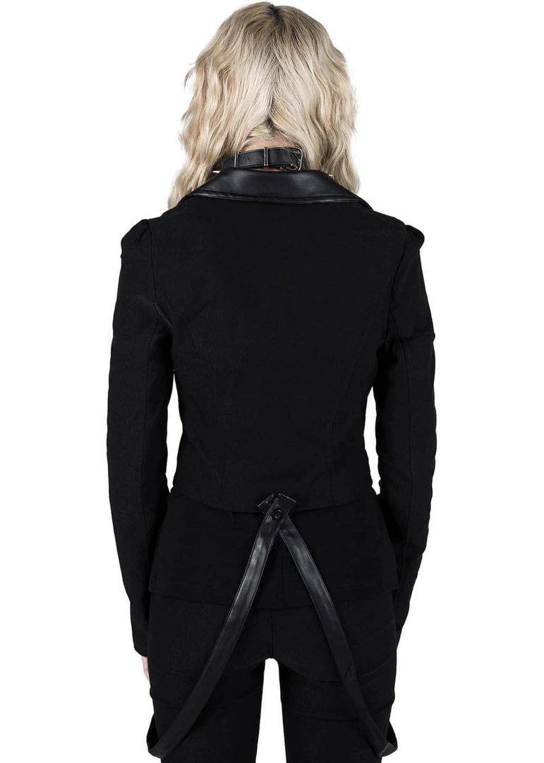 The suspender-look is part of the powerwoman style, and Killstar casually puts a crucifix in there, too 😉 This close-fitting jacket looks super strong with her faux-leather details in the colaar and the suspenders. She closes with buttons in the front.
