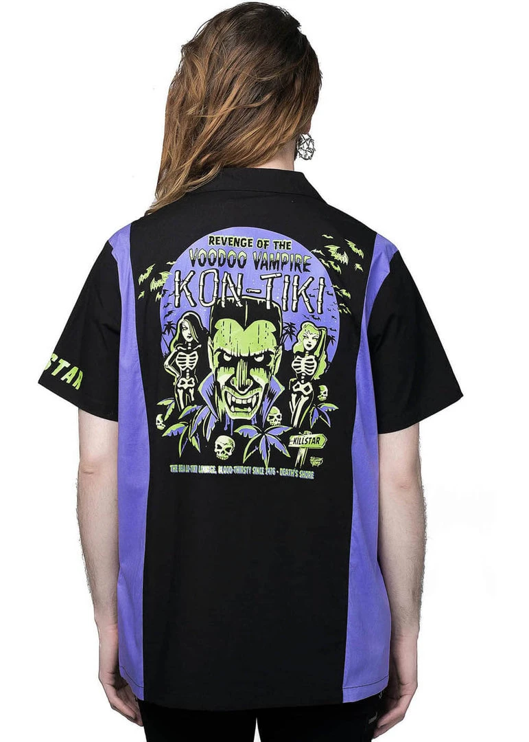 Beware the wrath of the Voodoo Vampire! The special designs by Vince Ray are shining on the soft cotton without stretch, and the top has a classic bowling-shirt-look with panels and the buttons in the front, with which it closes.