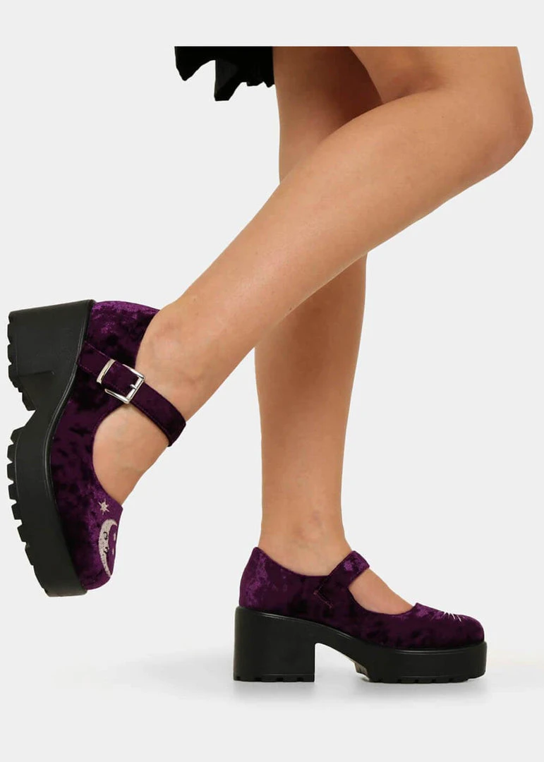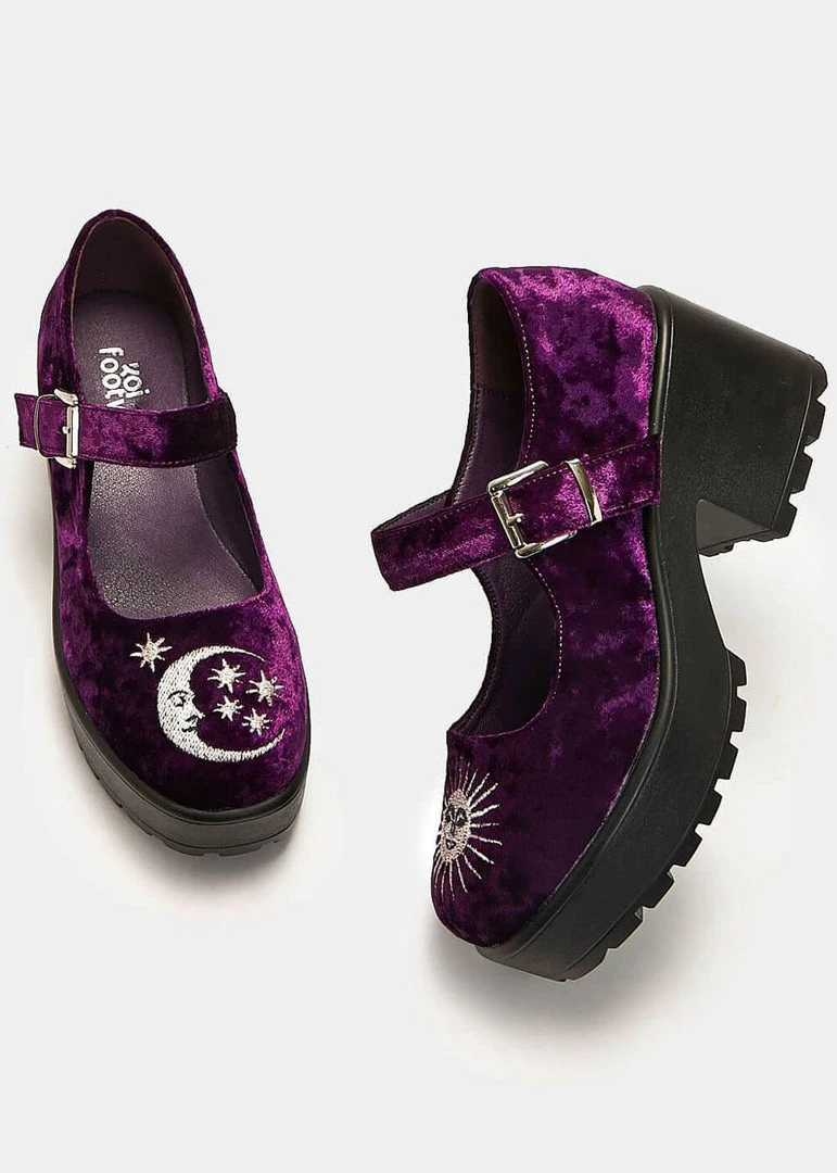 Velvet covered Mary Janes, with sun & moon embroidery? A witchy dream coming true!