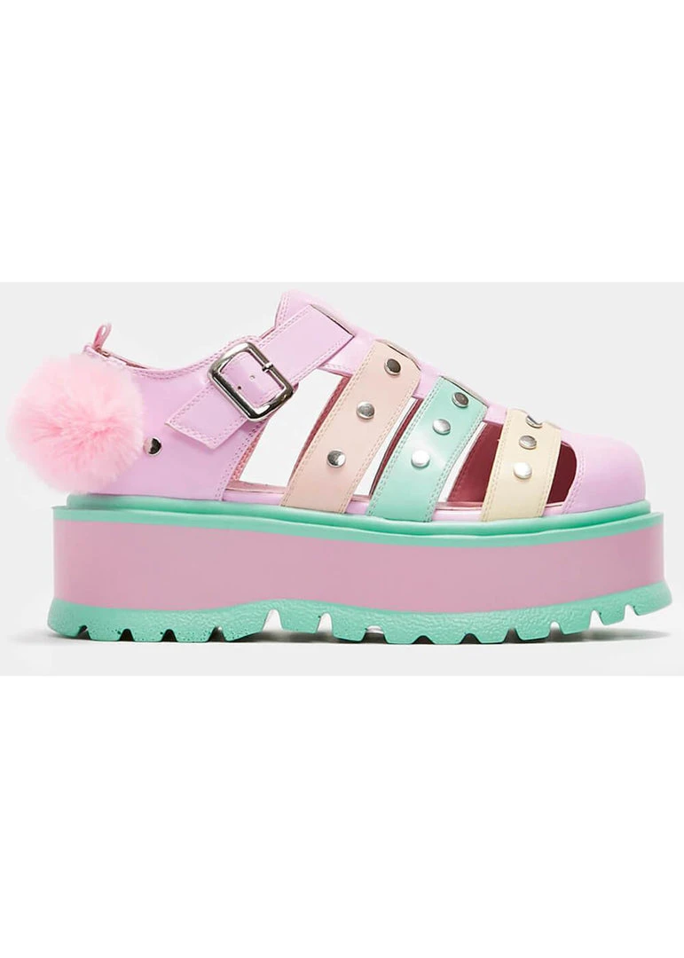 All your pastel dreams come true with Nyoka! You feel like an ice cream with her happy pastel shades of pink, yellow and green. Not only the straps, but also the adjustable strap she closes with is covered in them, even the platform has 2 colours!