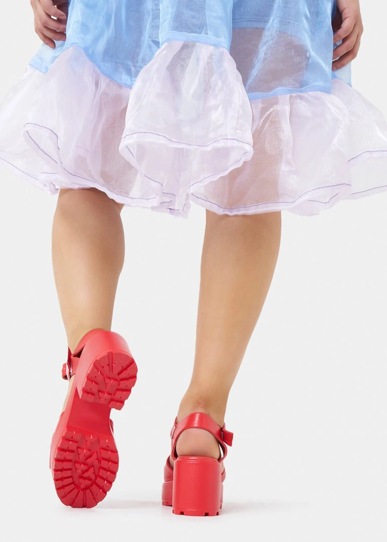 Heels: 7,5 cm. Platform: 3 cm. Materials: 100% Peta Approved Vegan. Outside: Fabric. Inside and bottom: Other materials.