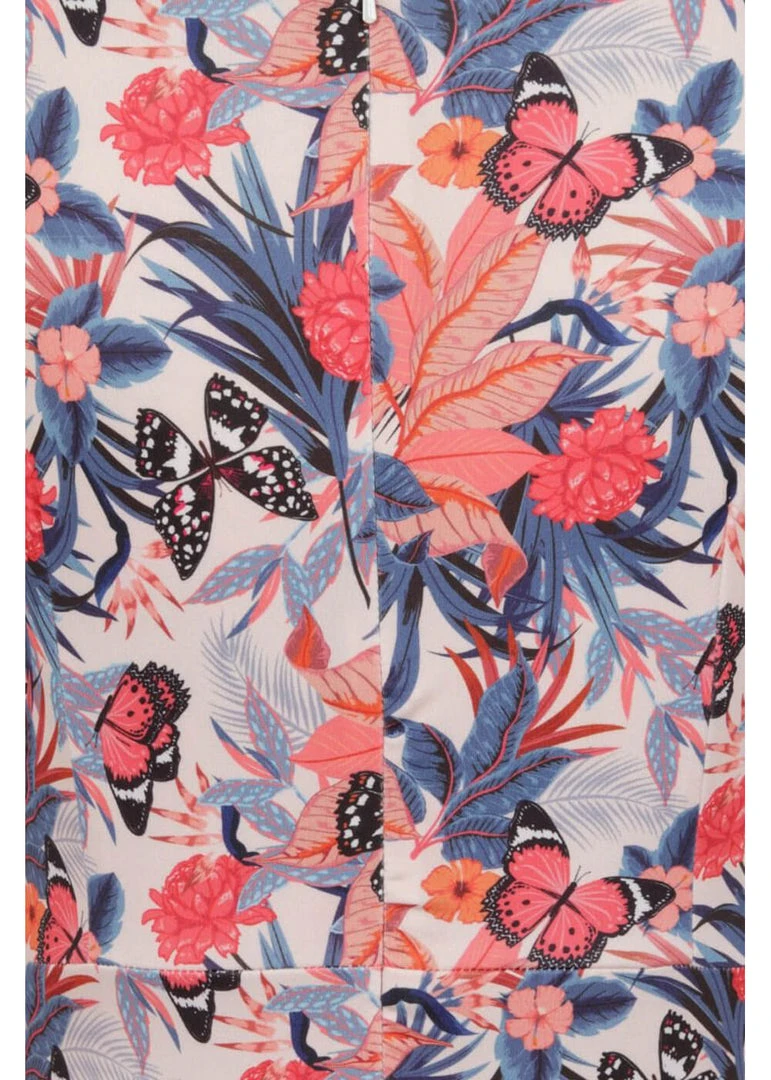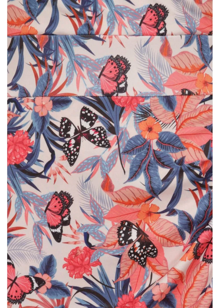 Her deep v-neck continues into a wrap towards the waist line, which is accentuated by a waistband. The pencil skirt has an extra layer draped across it, which, on the side, continues into a tropical waterfall effect.