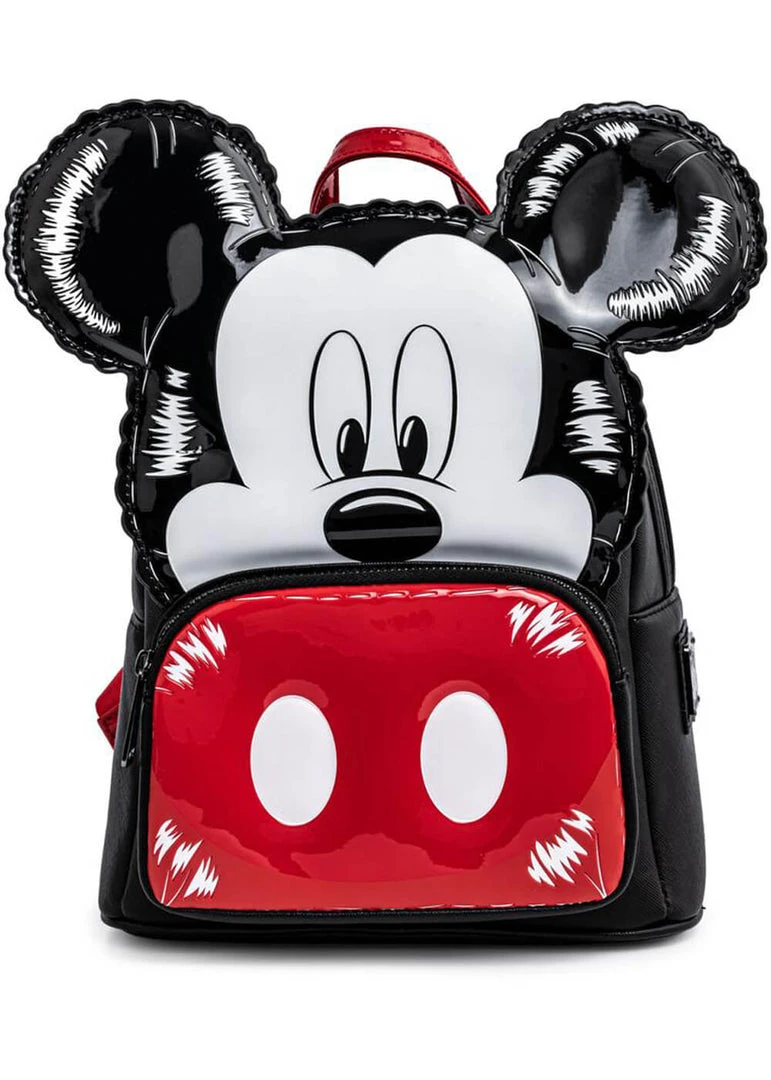 Don’t worry, they’re not really balloons, but glossy patent that is shining from the faux-leather backpack! The glossy front compartment, which closes with a zipper, is his iconic outfit.