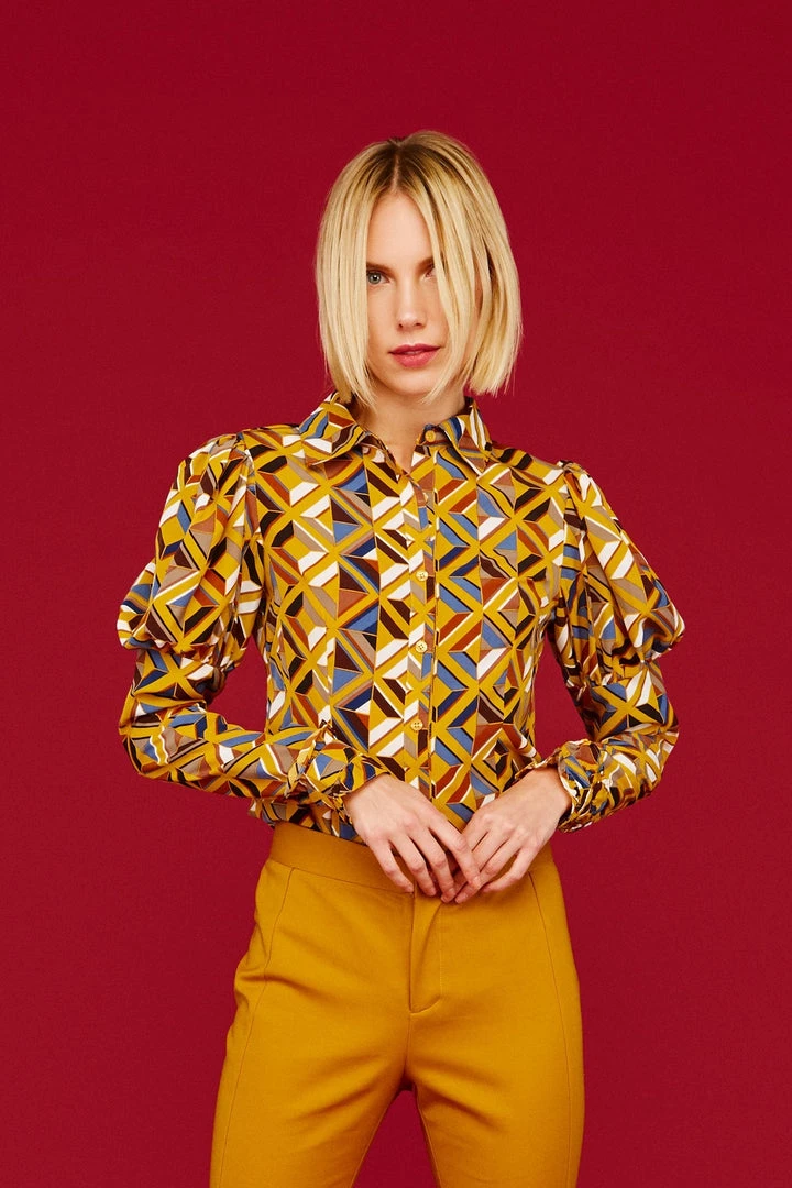 Get hypnotized by Greta’s geo lines, that even run across the collar! She’s made of a smooth fabric without stretch and closes with smooth buttons in the front and at the ends of the sleeves, that are adorned with 2 gathered seams. The shoulders are spectacular with the puffy top thanks to the pleats, before she continues as a close fit.