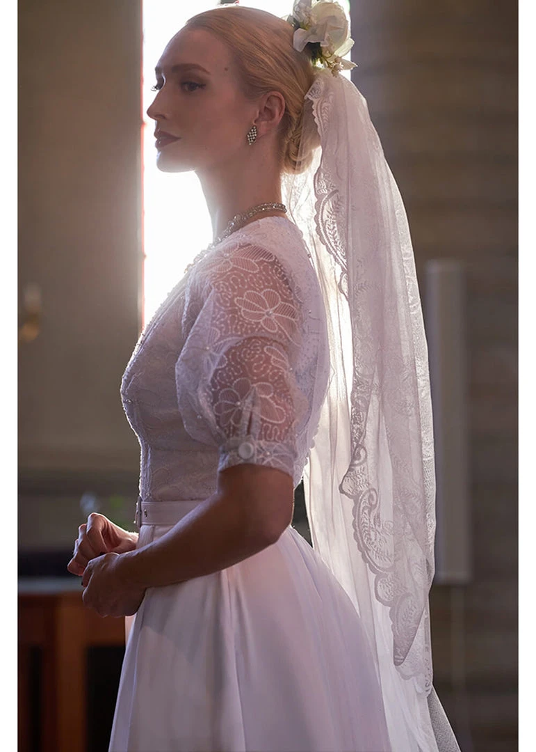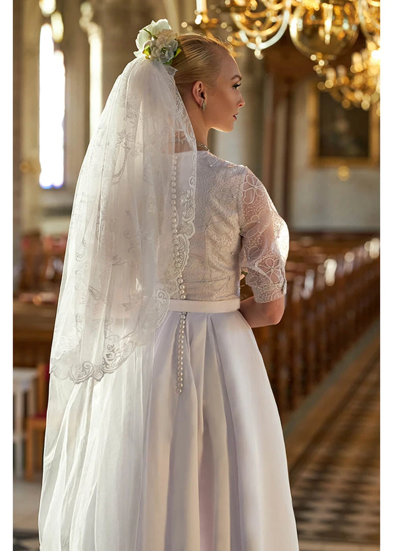 It almost seems like a with lace covered jacketd with her stunning buttons and patterns, but it really is one beautiful piece… The back is decorated with faux-pearls that open, but she also has a zipper at the side.
