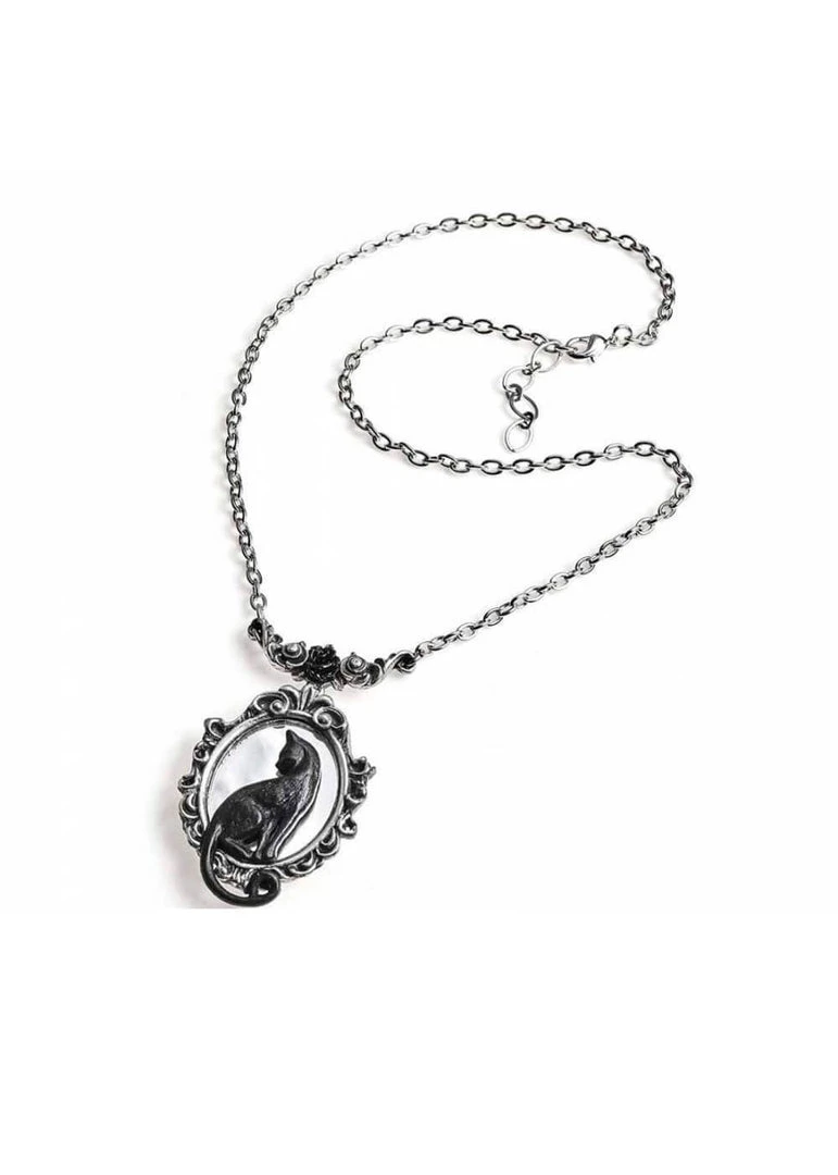 A kitty diva knows her spot: in front of the mirror! On this stunning necklace she can be seen sitting infront of a genuine mirror, with a gorgeous baroque frame.