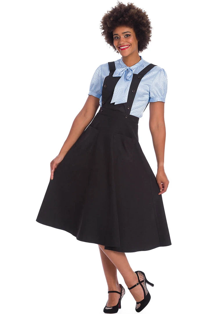 If you wear her with an elegant blouse, a feisty turtleneck, a happy t-shirt or a cozy cardigan, this pinafore is the base for so many fantastic looks, do as you feel! This beauty is made of a smooth fabric without stretch, that dances along with all your moves.