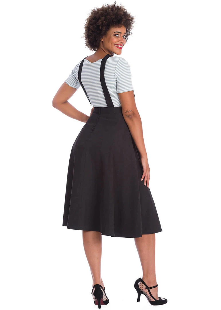 She is definitely smart: The buttons on the bib are working with the button holes in the skirt. So you can play with the length, or take it off completely with the shoulder straps and wear her as a skirt: twice the fun!