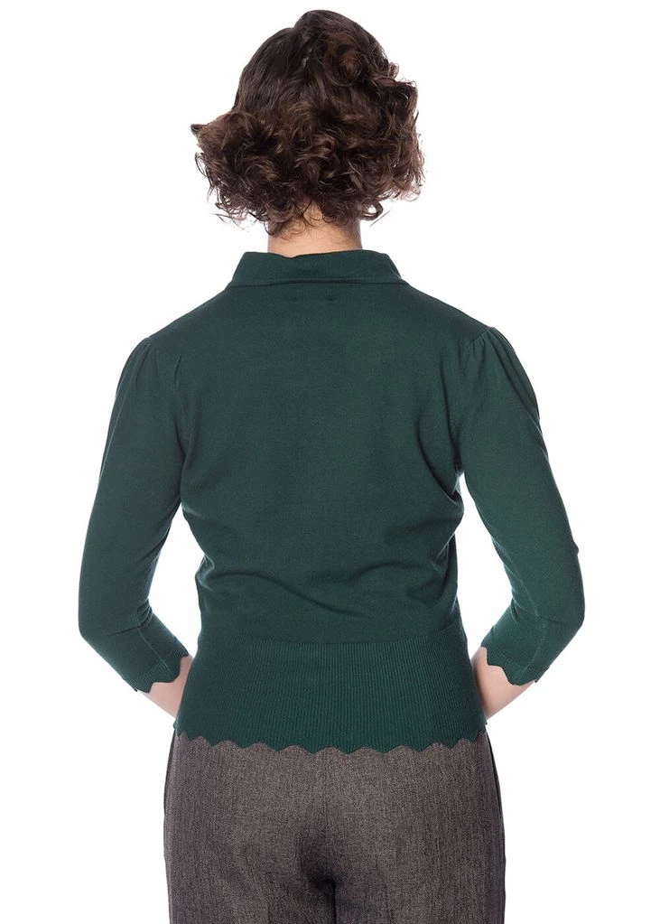 The waved edges next to the smooth buttons and even around the edges and the ribbed sleeves and bottom they’re adding a sweet 40’s look. Like we’re used to by Banned, this beauty is made of a lovely soft viscose-mix, so she has a lovely stretch and feels nice and cozy to wear.