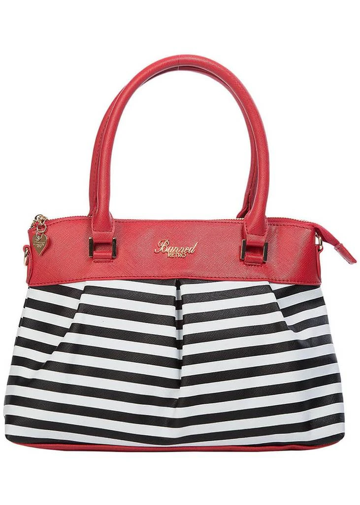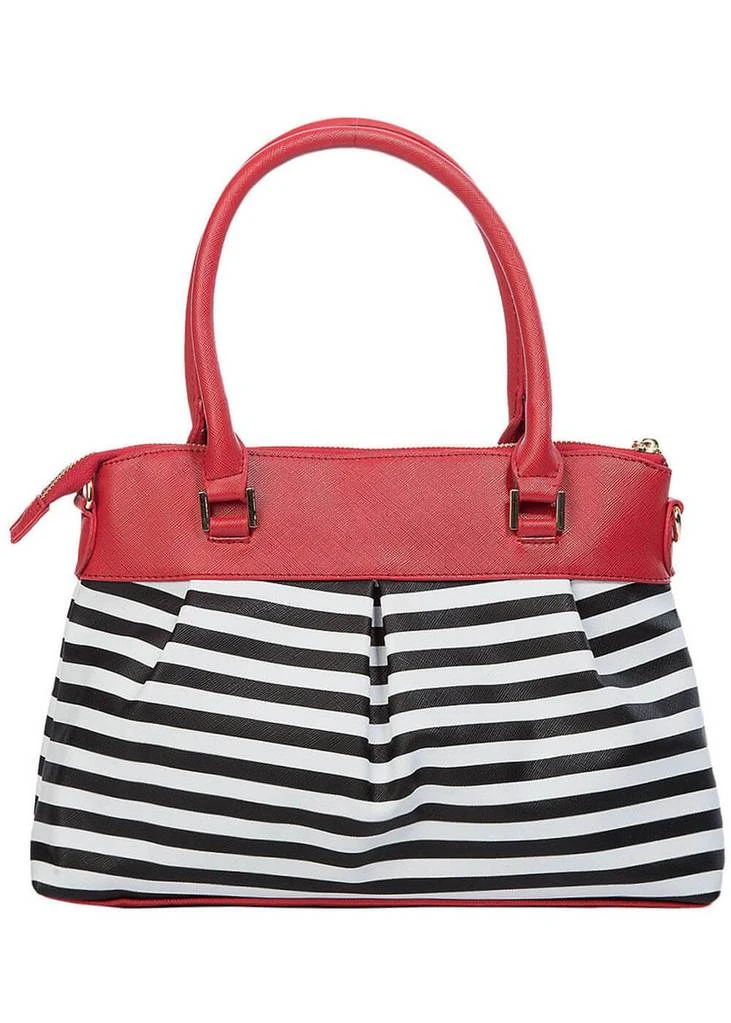 When you look at her, you can almost smeel the sea and hear the horns of the ships, what a beauty! Her fine quality faux-leather keeps its shape nicely, the red top with the gold-coloured logo and the pipings make her extra fun. She has 1 compartment, a zipper pocket and 2 pockets on the inside, so she’s big enough for your phone, a bottle of water, wallet and some make-up. She closes with a zipper on the top and you can simply hold her on the handle, or you usse the detachable shoulder strap.
