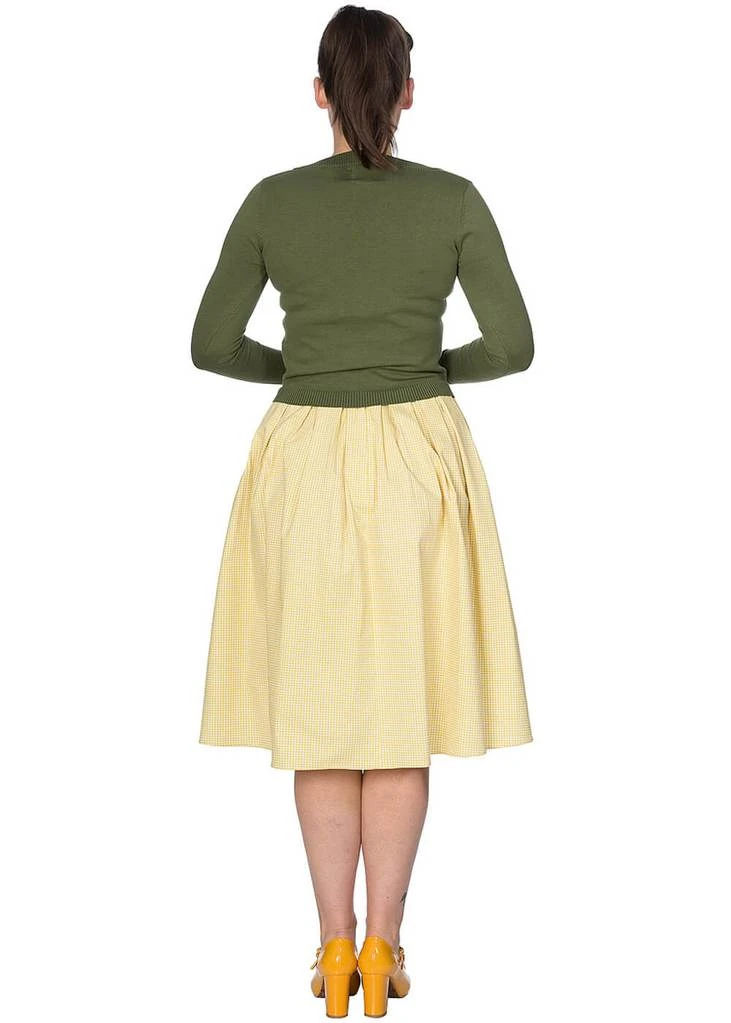 This cutie has a classic 50s line and from the waist down she flares out through flat pleats into a playful skirt with pockets. To finish the look you can wear her with one of our petticoats. She’s, made of a beautiful quality cotton-mix which feels like bengaline and has a slight stretch. She closes with the zipper on the back and with a height of 1,70 she reaches down to the knee.