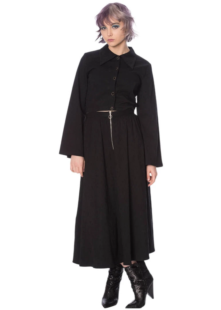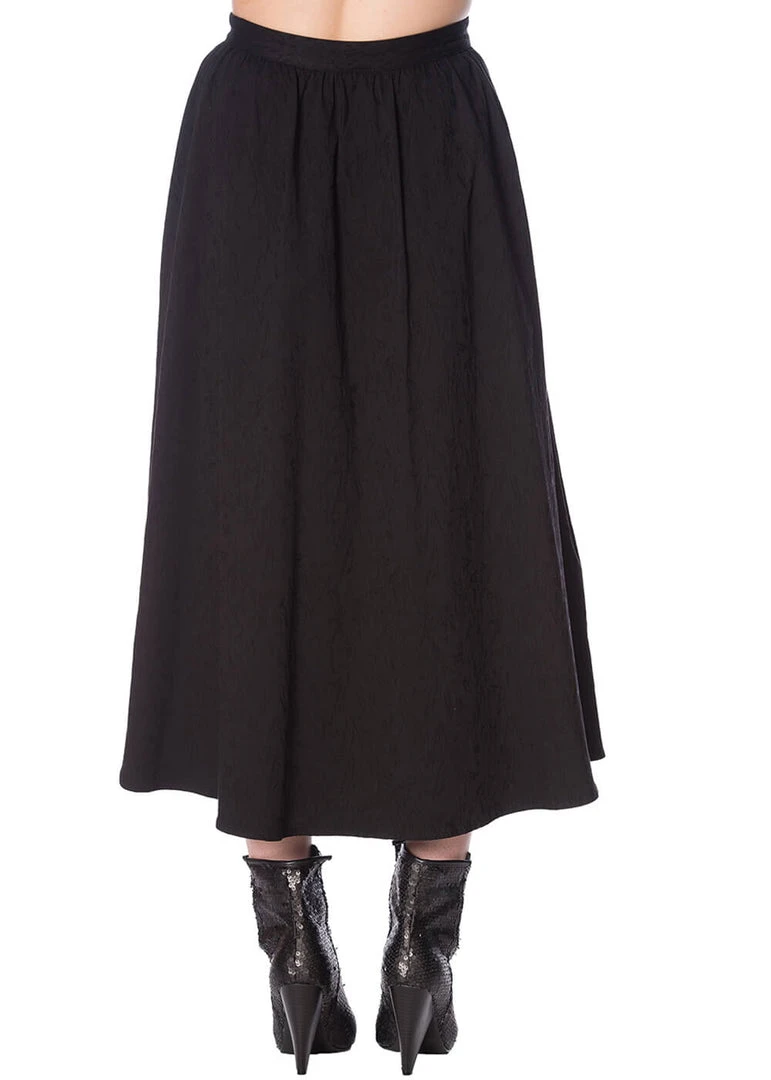 Whether you wear her with a simple top, a fancy blouse or a cozy sweater, with heels, sneakers or boots, this beauty gives you so many options… From the waistband, small gatherings flare into a full skirt until about halfway down the calves. She closes with a zipper in the front and her lightweight viscose-mix with fine stretch falls just as lovely as it feels.