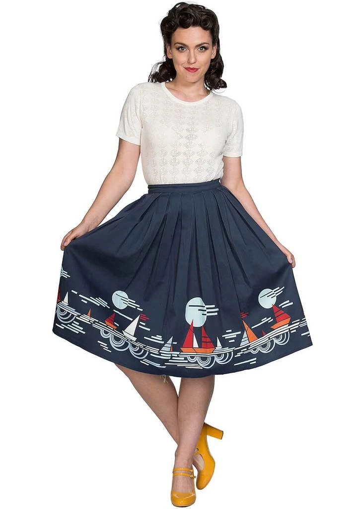 The cheerful sailboats keep sailing around your skirt… This cutie has a classic 50’s line and from the waist downwards, through flat pleats, she flares out into a playful skirt. To make those boats sail out you can wear her with one of our petticoats!