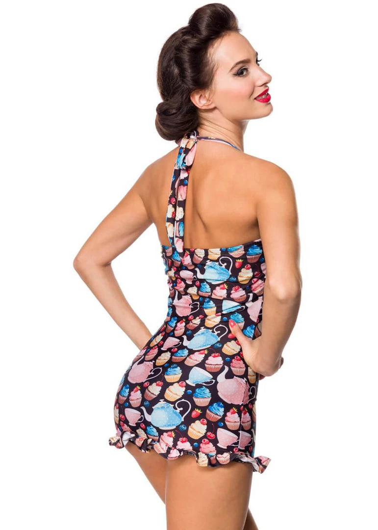 Oh lala, we’d love to wear Molly everywhere! This beauty has preshaped, padded cups with wire and a halter that you tie in the neck. Thanks to the elastic in the back and at the legs, she stays nicely put. The top layer falls over your hip, where she has a playful ruffle.