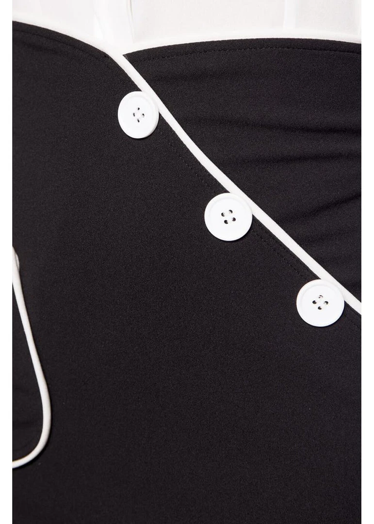 The Saigon pencil skirt accentuates your waist in an elegant manner: with a subtle v in the middle! The white piping along the top goes on to the hip, and the white buttons and the pocket give it a classic 40’s look. It’s made of a smooth jersey fabric with 20% elastane, which makes it feel soft and gives it a fine stretch.