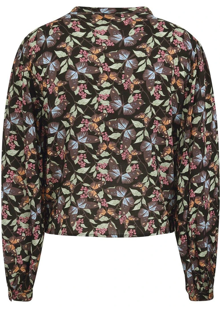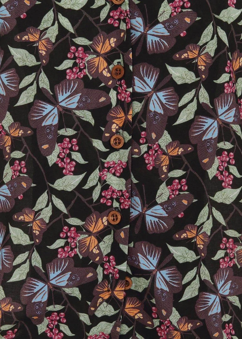 Her 100% rayon without stretch are so lightweight, the butterflies seem to fly off of her! Meredith closes with wooden buttons in the front, which you can also find on the cuffs of the long, puffy sleeves. She has a relaxed fit, that you can also beautifully wear a bit puffy with a high-waist skirt or trousers.