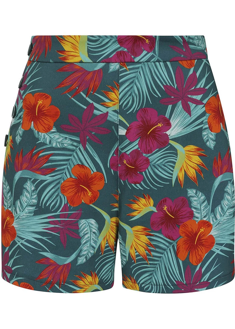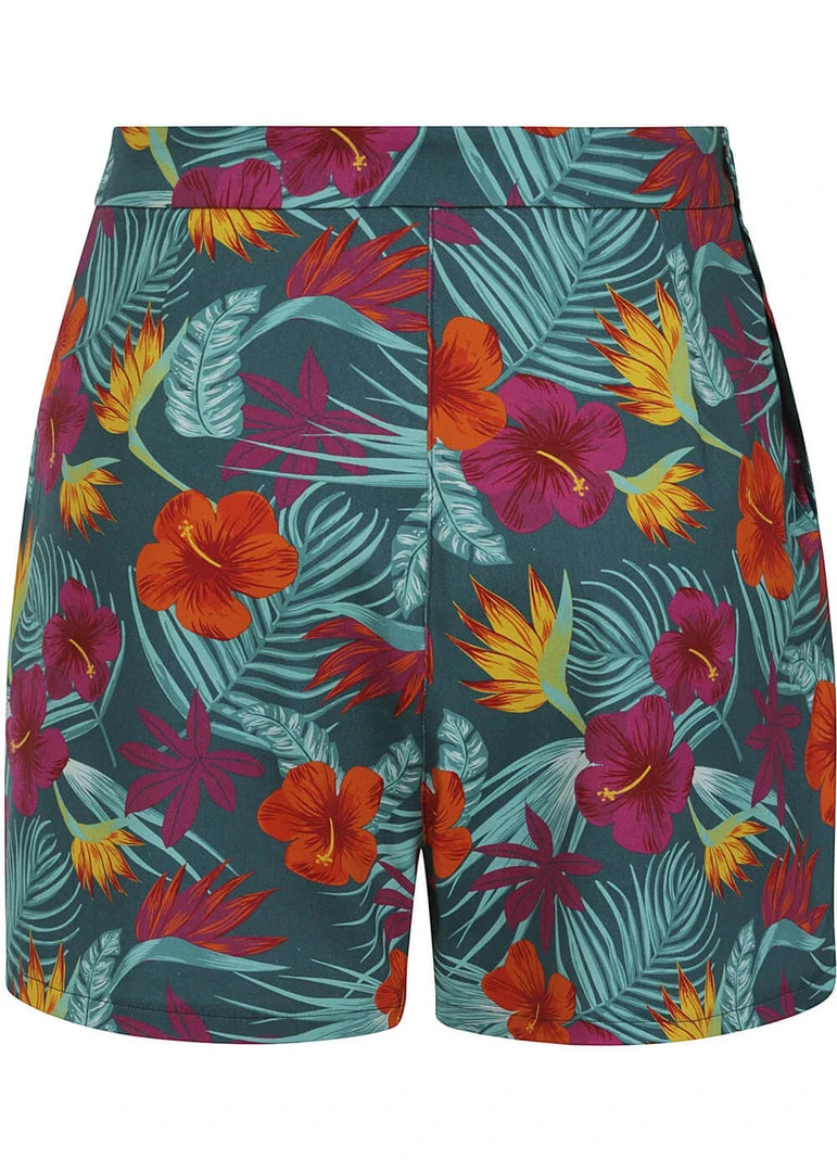 Exotic flowers are covering Adriana, what a tropical scenery… And she’s so lightweight with her cotton-mix with slight stretch and a satin finish! The high waist is accentuated by the waistband, from where she flows closefittingly over the hips (with pockets!) and then flares into wide, rolled-up trouser legs. The buttons on her left side are not only looking great, they are also how you close Adriana.