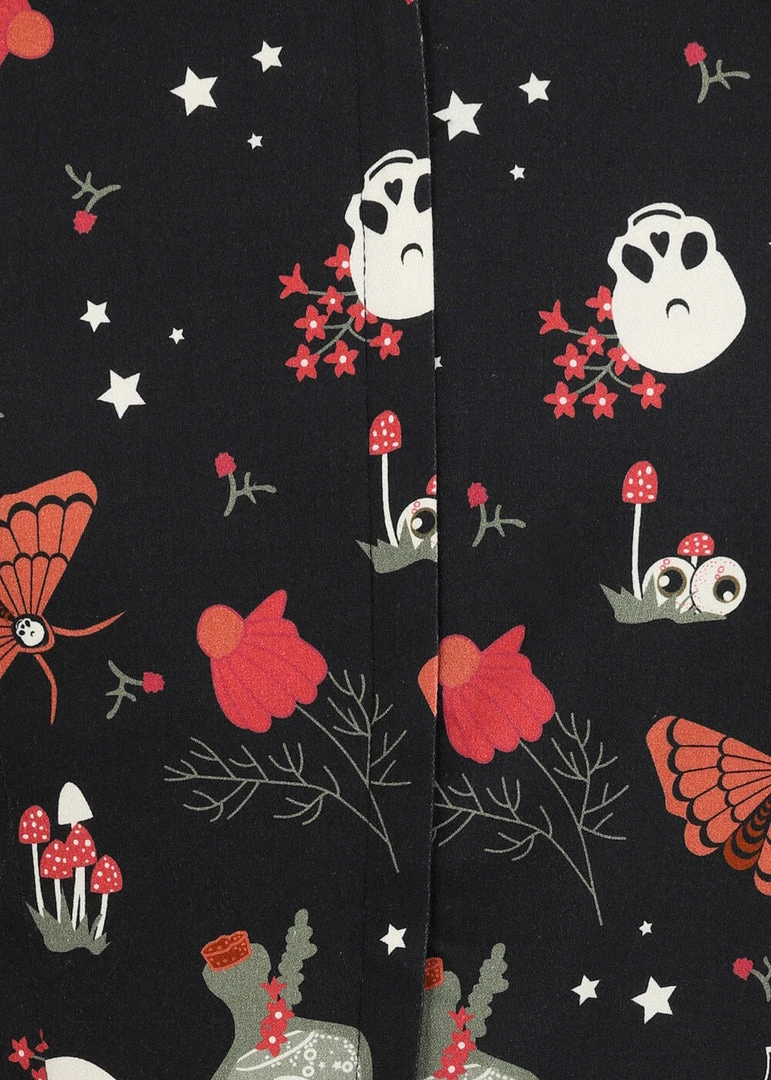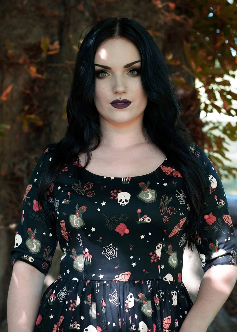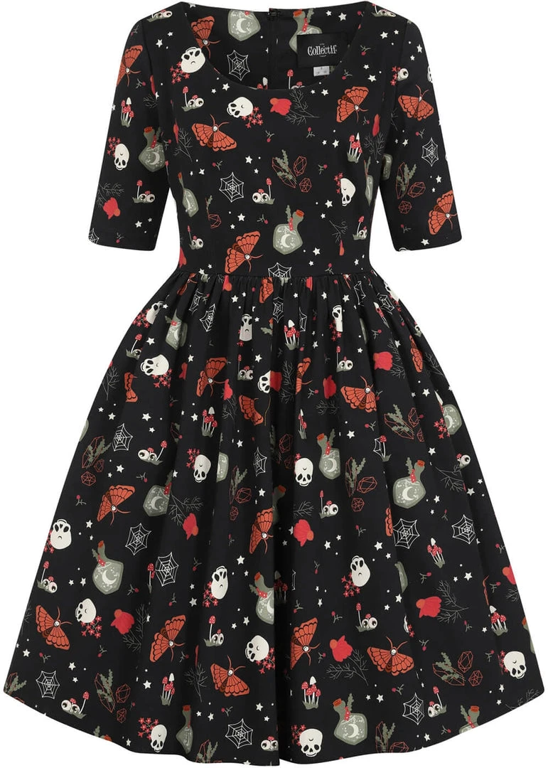 This beauty is made of a beautiful quality cotton-mix with a slight stretch and a satin finish, making those colours shimmer your way. The waist is accentuated with the seam, down from which she flares out into a full skirt through narrow pleats. She’s perfect for combining with one of our petticoats for that festive look! With a height of 1,70 she reaches down to the knee and closes with a zipper on the back.