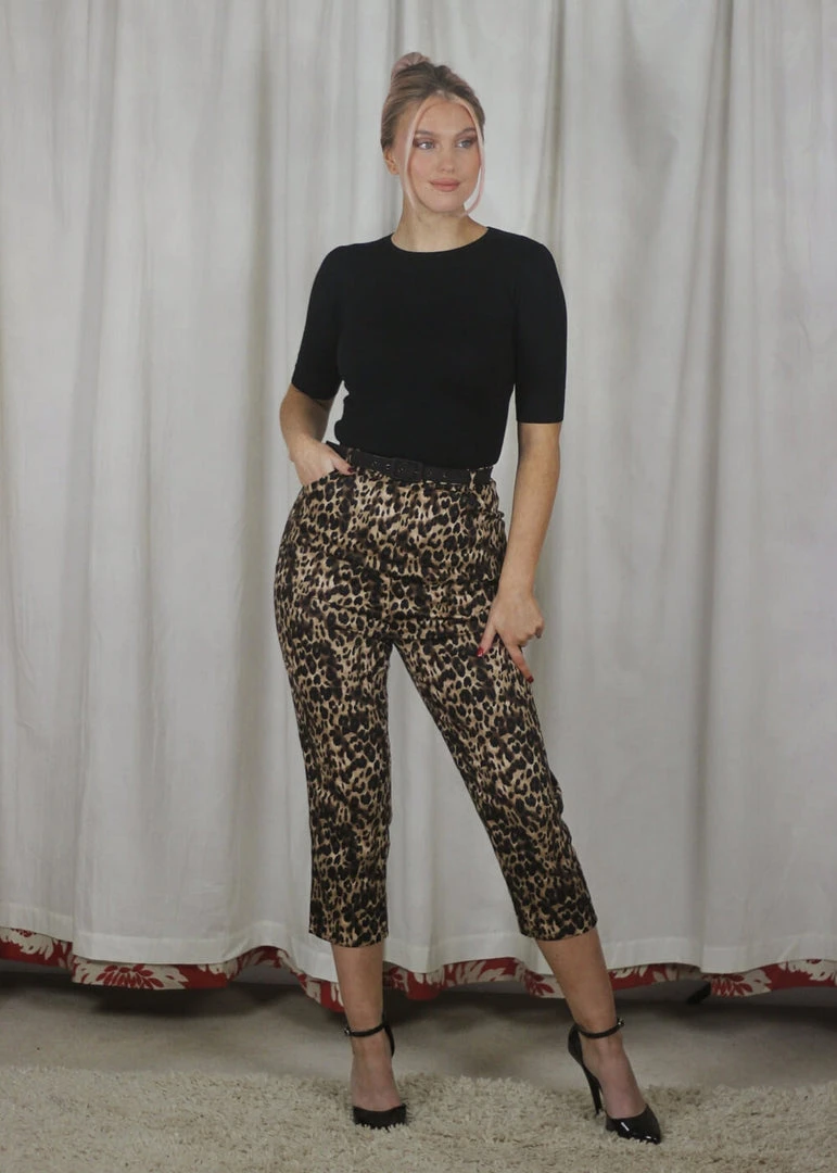 The leopard print on this stunning cotton-mix with slight stretch and sateen finish is the Rock ‘n Roll jackpot, of course. Betty has a high waist, that you accentuate with the detachable belt, and goes on close-fittting until just above the ankles for a height of 1.70m. She closes with a zipper in the front. Pair her with a cool t-shirt or jumper and you’re ready to swing those hips 😉