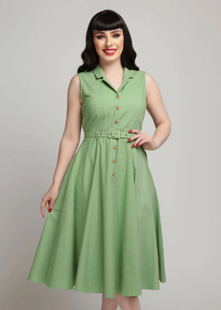 The beautiful quality cotton-mix has a very slight stretch and feels like a dream to wear. She closes with the buttons across the front, creating a timeless shirt-look. The waist is accentuated by the belt, down from which she flares out into a full swing skirt which with a height of 1,70 reaches down over the knee. You can also gorgeously combine her with one of our petticoats . She even has little pockets!