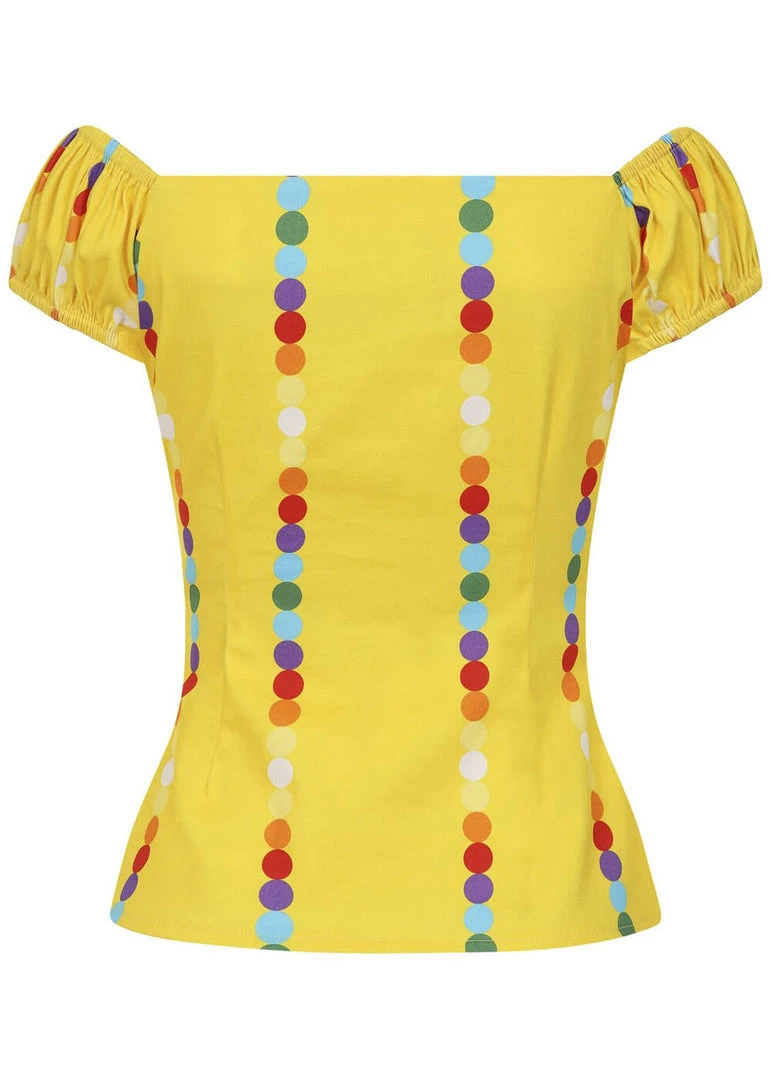Dolores is THE classic among Collectif tops, with her sexy pinup appearance thanks to the sweetheart neckline and the typical carmen style sleeves, which are slightly puffy because of the elastic.
