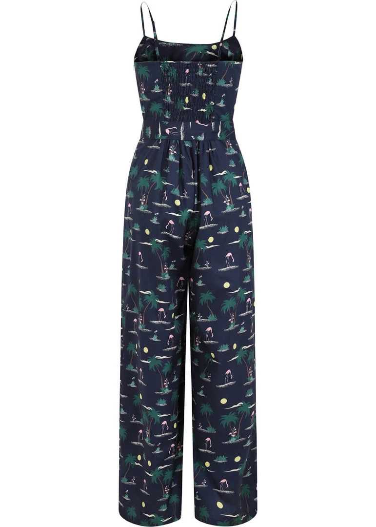 Despite the hot sun you’re staying nice and cool because of her airy cotton without stretch and her adjustable shoulderstraps. The waist is accentuated by the sash, down from which she flares out into flowy trouserlegs, which with a height of 1,70 easily touch the floor. She closes with a zipper on the side and a nice bonus: the back is partly elastic and she’s got pockets!