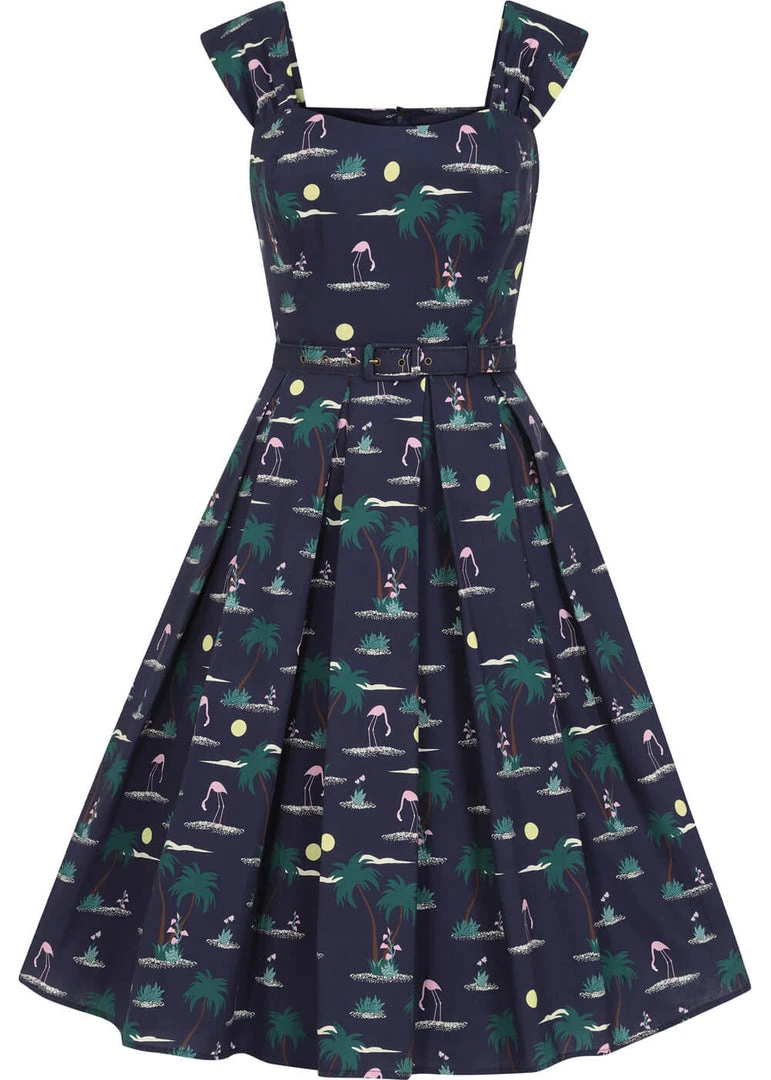 The waist is accentuated by the belt, down from which she flares out into a playful skirt. To make those birds shine you can combine her with one of our petticoats. With a height of 1,70 she reaches down to the knee and closes with a zipper on the back.