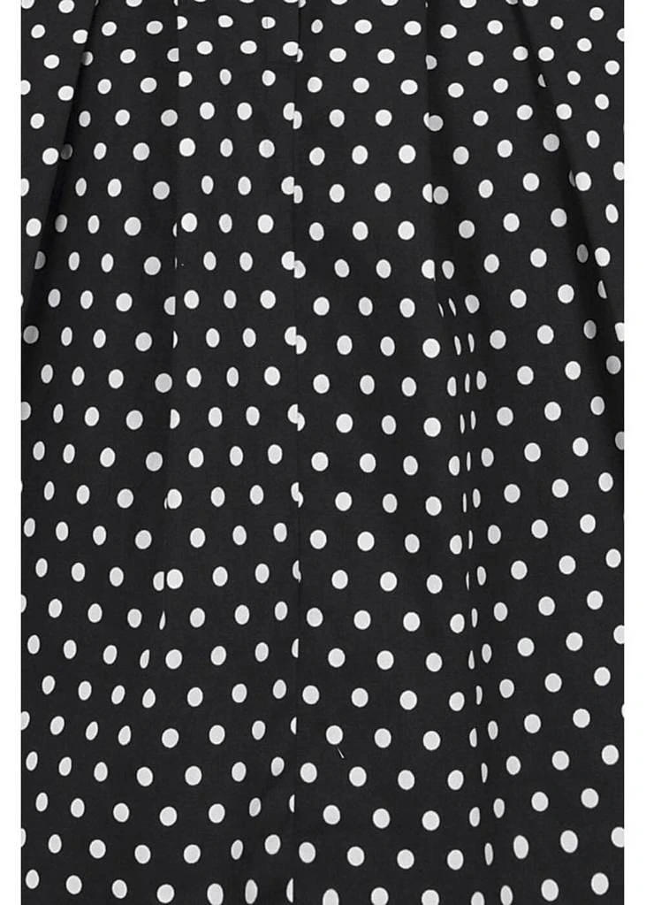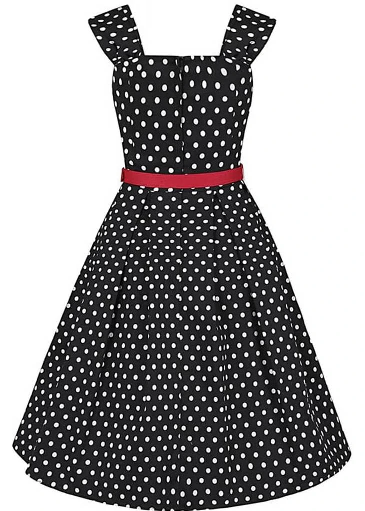 The waist is accentuated by the loose belt, down from which she flares out into a playful skirt. To make those dots dance you can combine her with one of our petticoats. With a height of 1,70 she reaches down just over the knee and closes with a zipper on the back.
