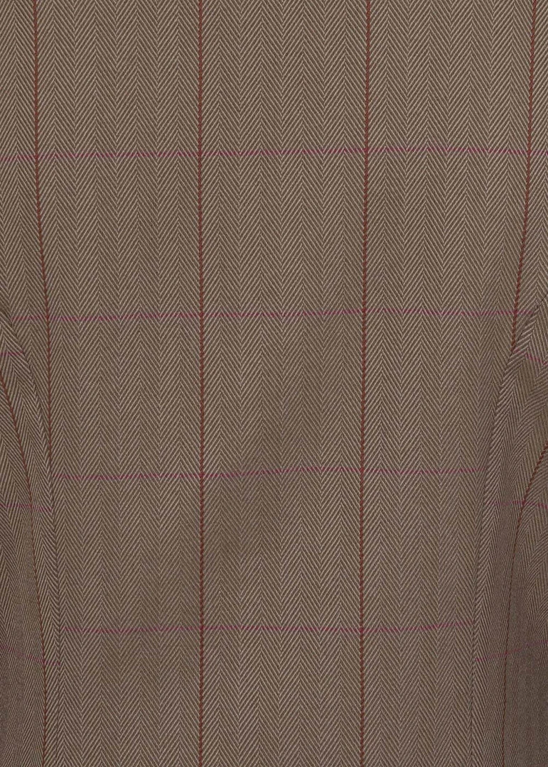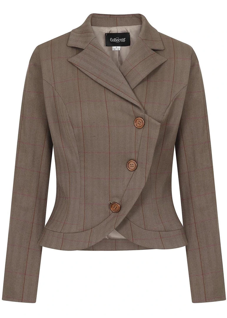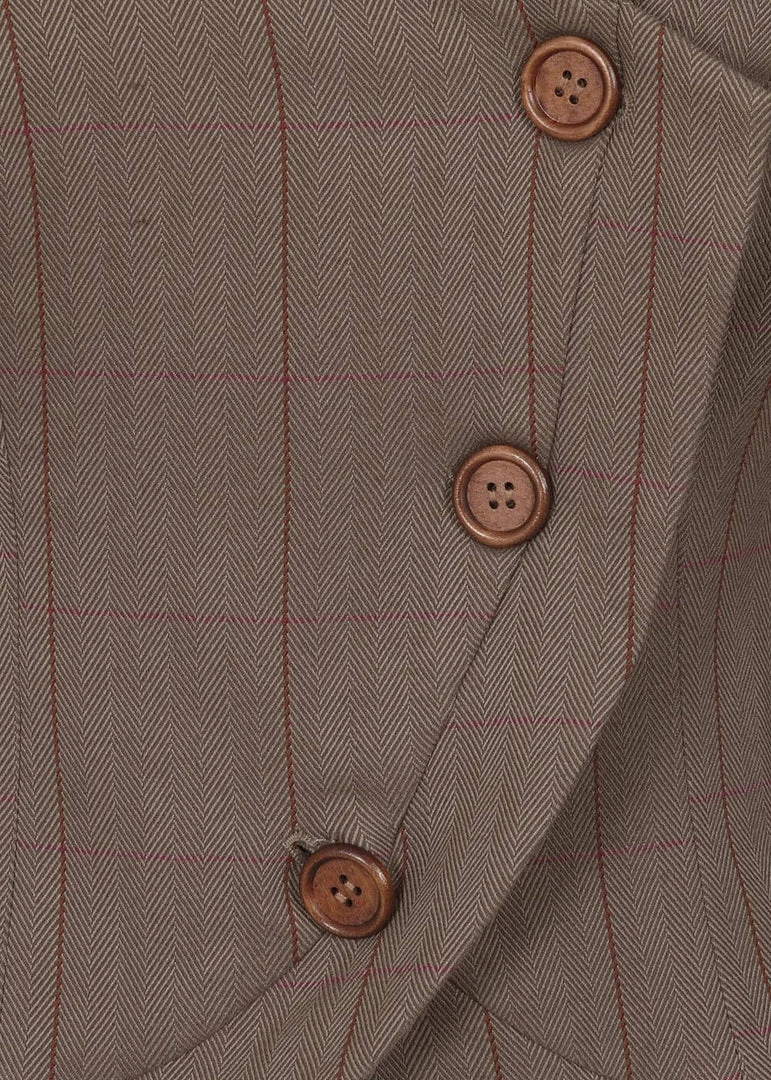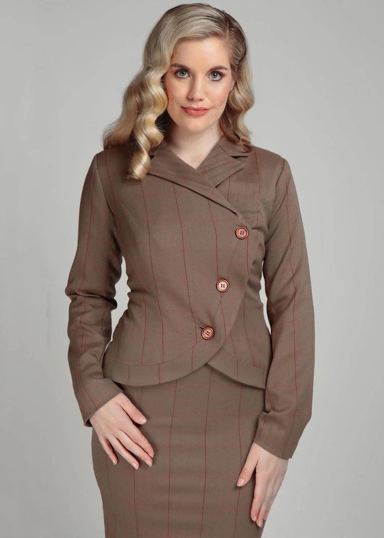 Take your look to a higher level with this gorgeous blazer, with her rich brown colour and the herringbone pattern with the red lines on a smooth fabric without stretch. The wooden buttons she closes with and the charming v on the bottom make for a classic 40’s look, even more so with the matching Sloan skirt!