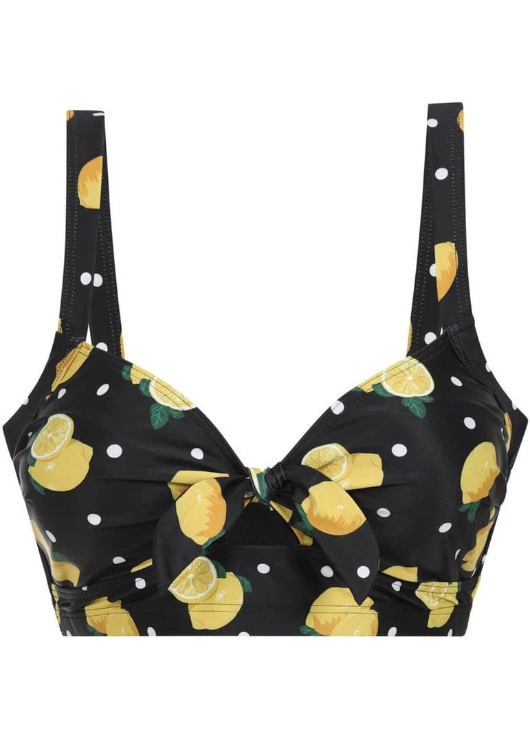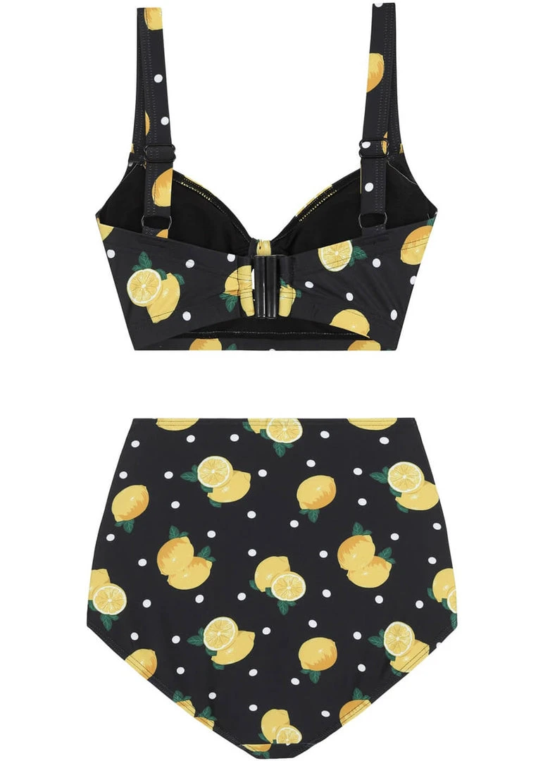 Step aside Itsy Bitsy Yellow Polka Dot Bikini, time for yellow lemons! This beauty has removable padded cups, a front which you can tie and adjustable straps for that perfect Pin Up look. She closes with a bikini clip on the back. Size wise this bikini top fits true to size, if you’re in between sizes we suggest sizing up, the stretch is accounted for in the sizing chart.