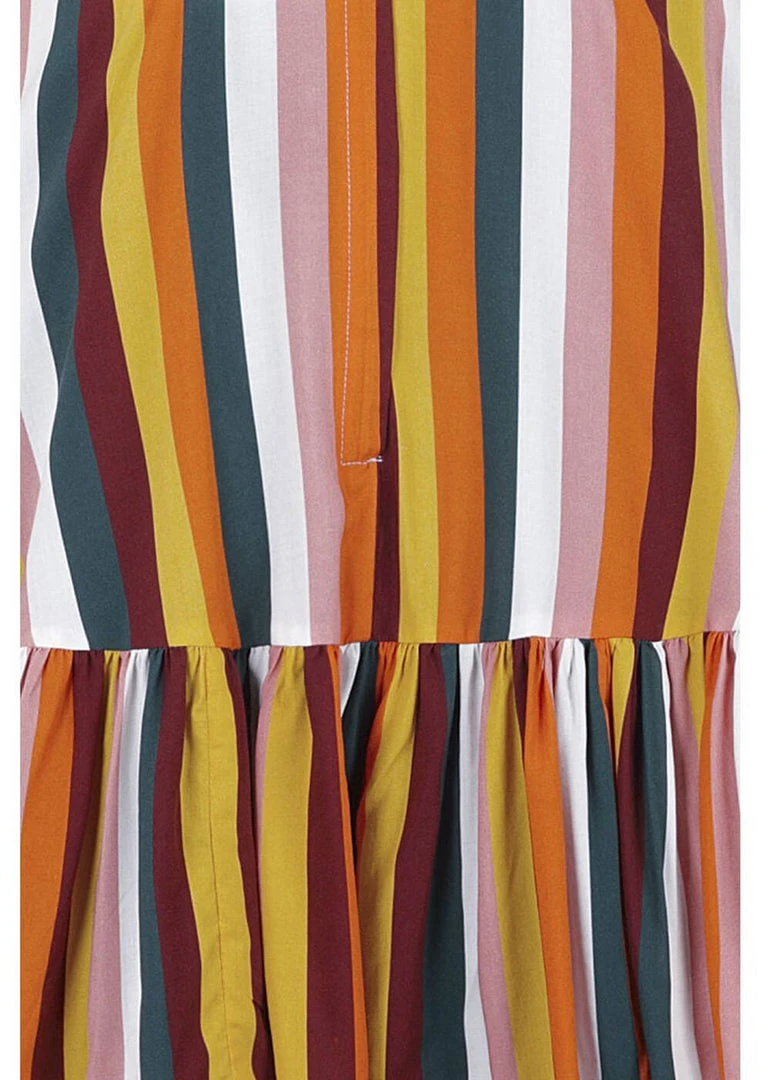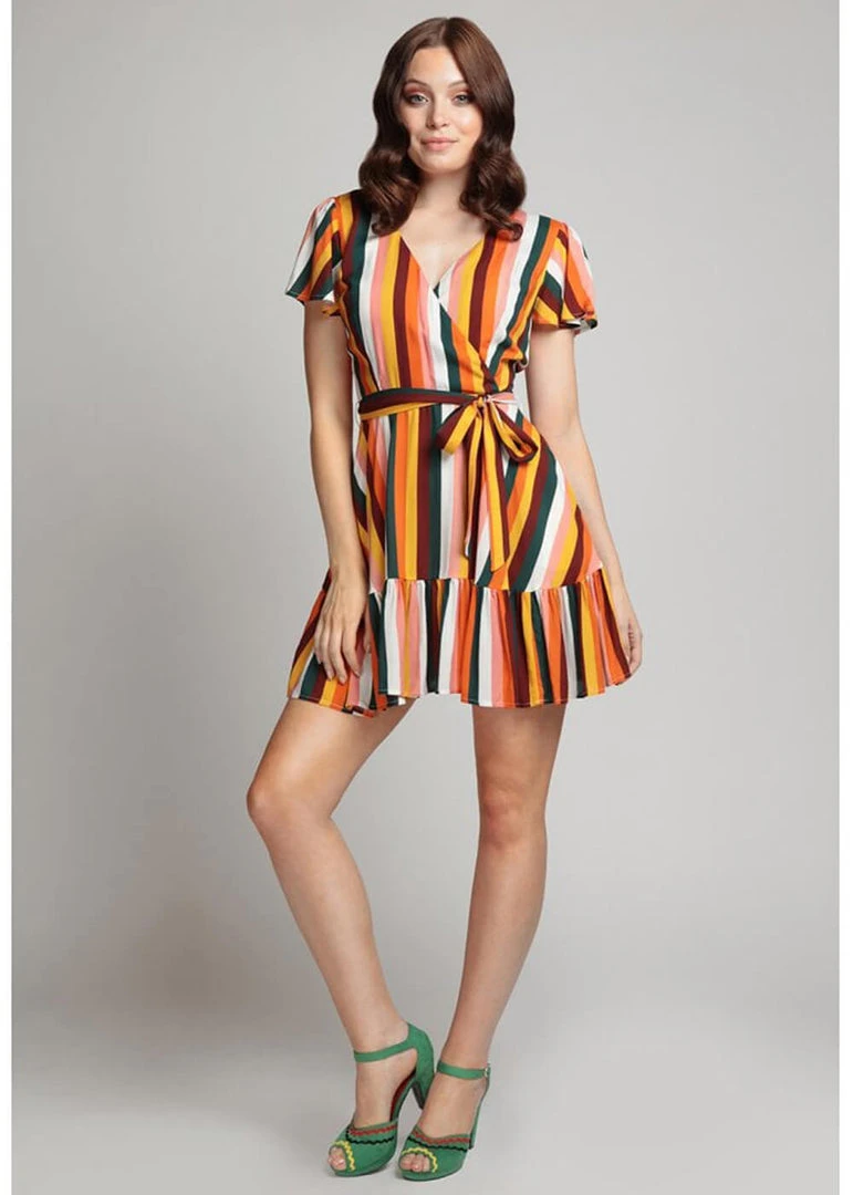 Her stripes are featured in our favorite warm colours, while the warm weather is no match for you thanks to her airy 100% viscose with no stretch 😉 Molly has angelic sleeves and a wrap on the chest. The waist is accentuated by the loose sash, down from which she playfully flares out into a pleated edge as a finish. With a height of 1,70 she reaches down above the knee and closes with a zipper on the back. Oh yeah, and she has pockets 😉