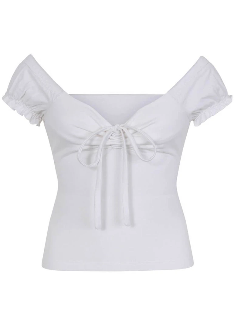 This cutie does everything for the ultimately sexy shoulder: thanks to the fine elastic in the sleeves, you can wear them off-shoulder. Add a Vavavoom cleavage by gathering the seam at the chest with the little strap and there you go: the perfect pin-up top is born!