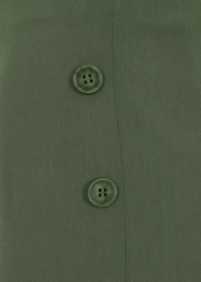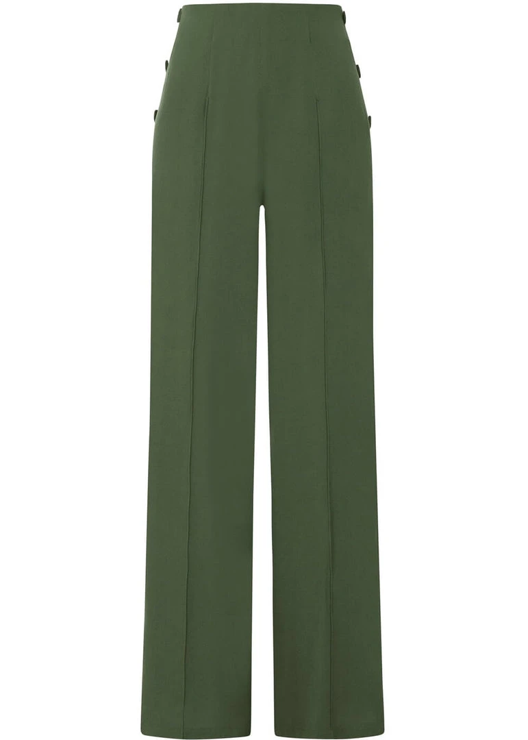 For the tortoise-look buttons on the sides alone you’ll fall head over heels! Her green viscose-mix feels lovely and airy to wear, making the wide trouserlegs cheerfully sway along with your moves. Because of the figure seams in the waist she’s beautifully formfitting, down from which she flares out into those full trouser legs. She closes with a zipper on the back.
