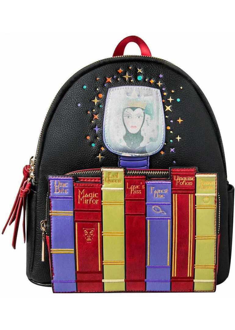 She sternly looks over her collection of spell books, which are forming the front compartment that closes with a zipper like the backpack itself.
